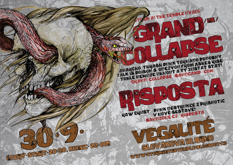 Po dvouměsíčním odpočinku se opět hlásíme s dalším kraválem. Minulý koncert byl tak trochu nostalgicko-melancholickej, tentokrát půjde o pořádnou ránu do držky. Trochu narychlo, ale někdy nejde uhnout a zůstat stát. A to bude platit i o samotným koncertu! Poslední zářijový den nás totiž navštíví tornádo GRAND COLLAPSE z waleského Cardiffu a anglického Bristolu. Zářezy jsou zatím dva- bezejmenný EP a aktuální výborný LP Far From The Callous Crowd. Hudebně jde o rychlej anarcho-thrash punk, zuřivej tak, jak má být. Jak říkali v Praze, vzpomeň si na Talk Is Poison, plus pomalejší pasáže se otíraj o From Ashes Rise. Ale když přijde na vlivy, tak je rozptyl větší - Conflict, Corrosion Of Conformity, MDC, Minor Threat, Refused, Mastodon, Rudimentary Peni, apod. Pokud se v tom začínáš ztrácet, tak věz, že zpěvák GRAND COLLAPSE je synek již zesnulého Stiggy Smega z legendárních Icons of Filth. Což se sice nepočítá, ale tady jablko nespadlo daleko od stromu a tohle budeš asi rozdejchávat dlouho! Taky proto, že tě na úvod večera zdecimuje několik už zlidovělých hitovek o konci světa z pera přísnotické RISPOSTY. Nový ksichty, starý vály, syrovej crust/punk a veselé historky z brněnské periferie.