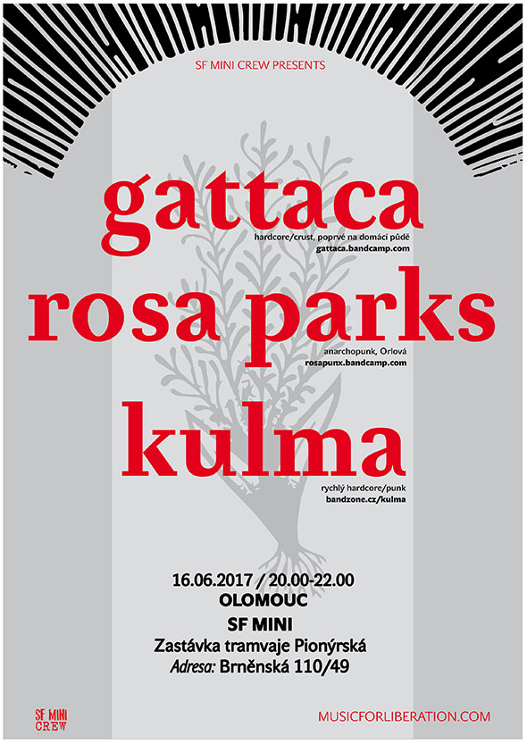 GATTACA // ROSA PARKS split 7" se musí oslavit. Gattaca - hardcore/crust, poprvé na domácí půdě https://gattaca.bandcamp.com/ Rosa Parks - anarchopunk, Orlová https://rosapunx.bandcamp.com/ Kulma - rychlý hardcore/punk http://bandzone.cz/kulma K oslavě nového splitu jsme pozvali jednu specialitu. Po dlouhé době zahrají Kulma, tedy trochu upravená sestava Sheeva Yoga. Pokud se podaří, budou mít novou kazetu.