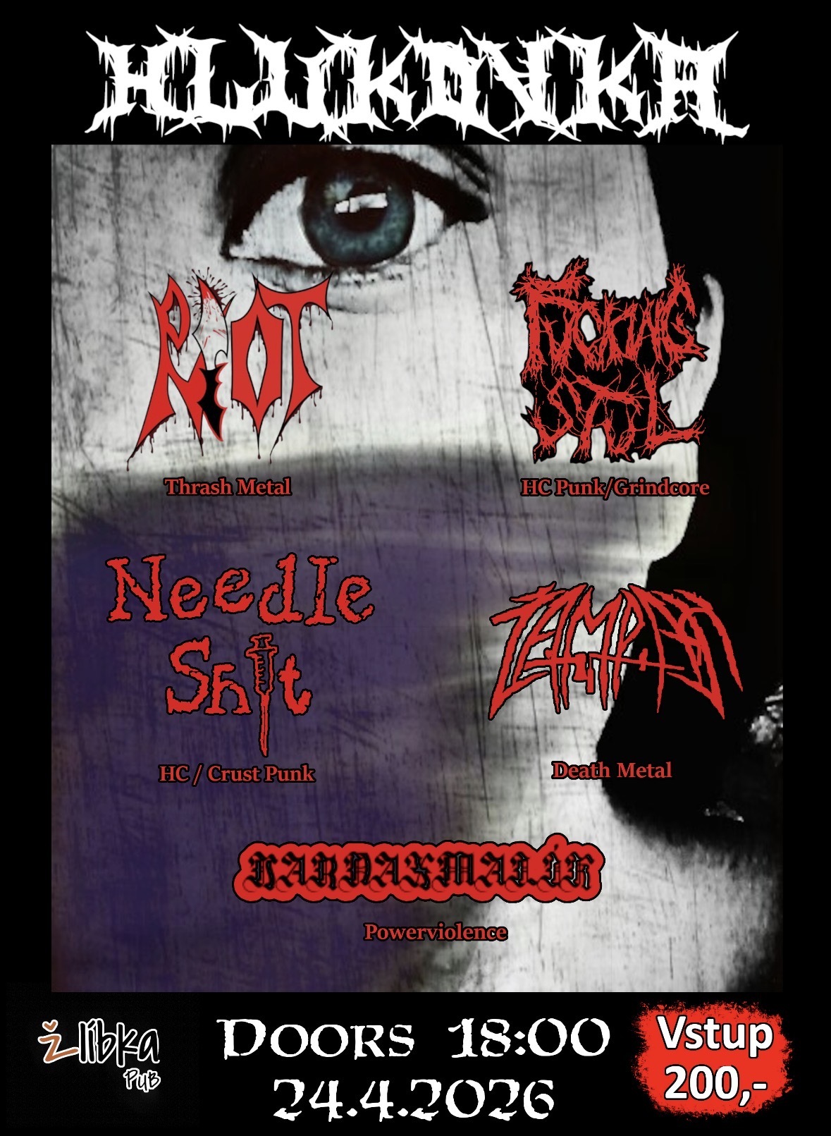 Line-up 18:00 Open Doors 19:00-19:30 RIOT (Thrash Metal) 20:00-20:30 Žampach (Death Metal) 21:00-21:30 Needle Shit (Hardcore/Crust Punk) 22:00-22:30 Fucking Stůl (Hardcore/Grindcore) 23:00-23:30 Jarda Malík (Powerviolence/Hardcore)