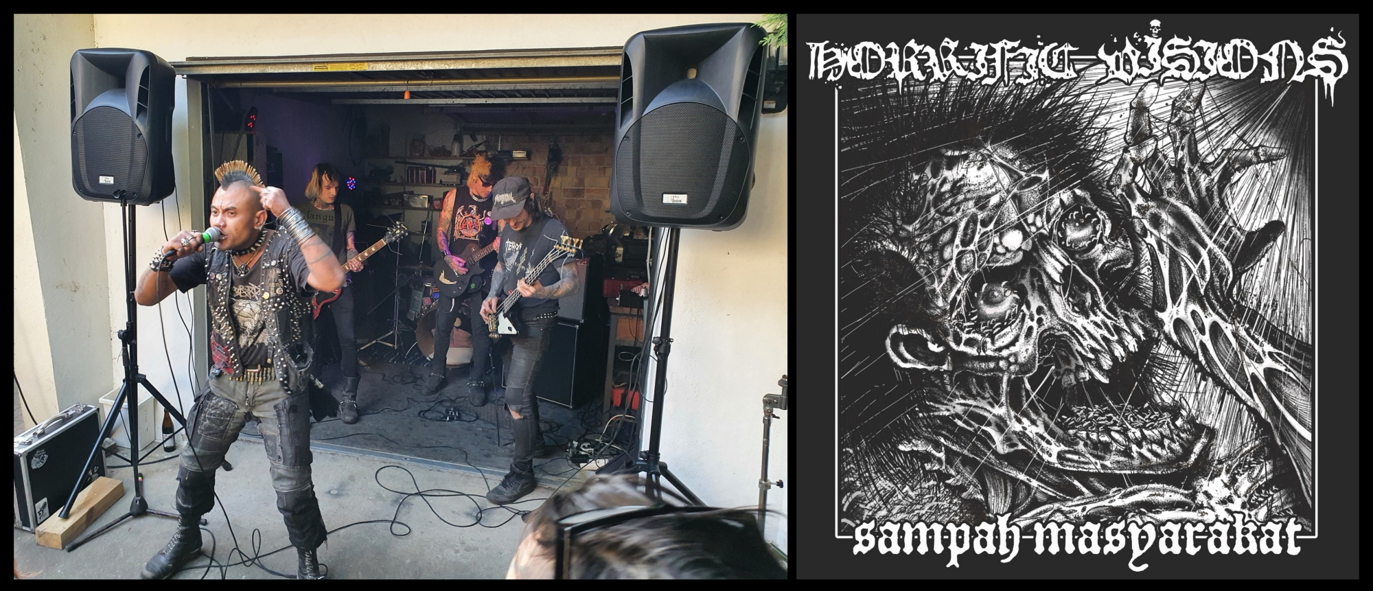 D-beat crust punk krev HORRIFFIC VISIONS přichází z blízkého Berlína s mezinárodní sestavou, starých známých, Daniho nová kapela. Členové prošli řadou kapel, určitě je znáte z různých festivalů a koncertů, pokud nesedíte doma, výkvět tohoto velkoměsta z různých států, Kolumbie, Polsko, Itálie, Německo do nás nasypou deset hrubě neotesných až primitivních crust punk skladeb se zvukem kovové baskytary, dodávajíc velké množství kytarových vyhrávek, nahrával Moro z kapely SpeedKöbra a o mastering se postaral zkušený Will Killingsworth (Dead Air Studios), je to surový a trvdý, přesně dle očekávání, včetně cover skladby od Driller Killer, oblíbenou píseň mohu uvést Sampah Masyarakat (název alba), celkový výsledek se povedl, posuďte sami,10 skladeb je k poslechu na bandcampu kapely. Venku by mělo být touto dobou dvanácti LP v různých barevných variacích.