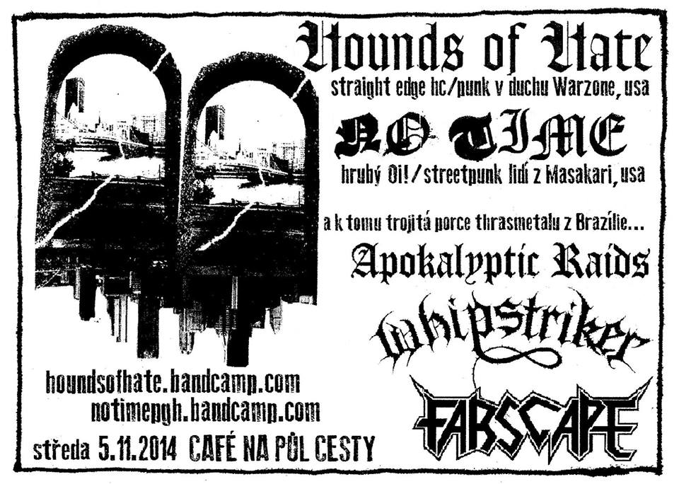 vzhledem k tomu že se musí končit ve 22:00 a jelikož Hounds Of Hate a No Time naskočili na už zabookovanej koncert tří brazilskejch kapel, s největší pravděpodobností celej tenhle večírek odstartujou. proto přijďte opravdu brzo, začínat se bude už okolo 18tý hodiny.