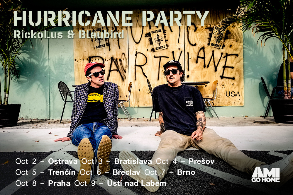 Florida – častý cíl hurikánů. Místní si už zvykli: „How to throw a Hurricane party: A Guide for the Uninitiated. Buy supplies. Beer, wine, tequila and weed. Slap plywood over your windows. Think, pirate with an eye patch. Spray paint HURRICANE PARTY on your front door. Come to terms with the meaninglessness of existence,“ vzkazují Hurricane Party neboli rapper Bleubird a písničkář RickoLus. Oba už v Česku několikrát hráli, oba jsou součástí zajímavé floridské scény (Radical Face, Astronautalis atd.). Po letech přátelství se sešli i na hudebním poli a jejich střet je strhující – pojmenováním stylu se nezdržujme: musí nám stačit, že to je prostě PARTY!!! 8. října hrají Hurricane Party v pražské kavárně Potrvá, start 20.00, vstup 230 Kč. Slibujeme, že BUDETE tančit!
