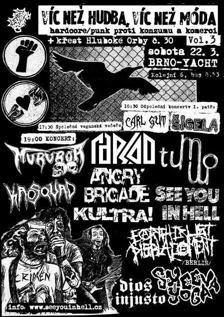 Hluboká Orba č. 30 (zbrusu nové číslo brněnského D.I.Y. hardcore/punkového zinu s 21 roky na krku, 200 stran v knižním provedení), freebox (= něco přines!), jídlo od Food Not Bombs Brno (www.foodnotbombs.cz), distra, infostánky.