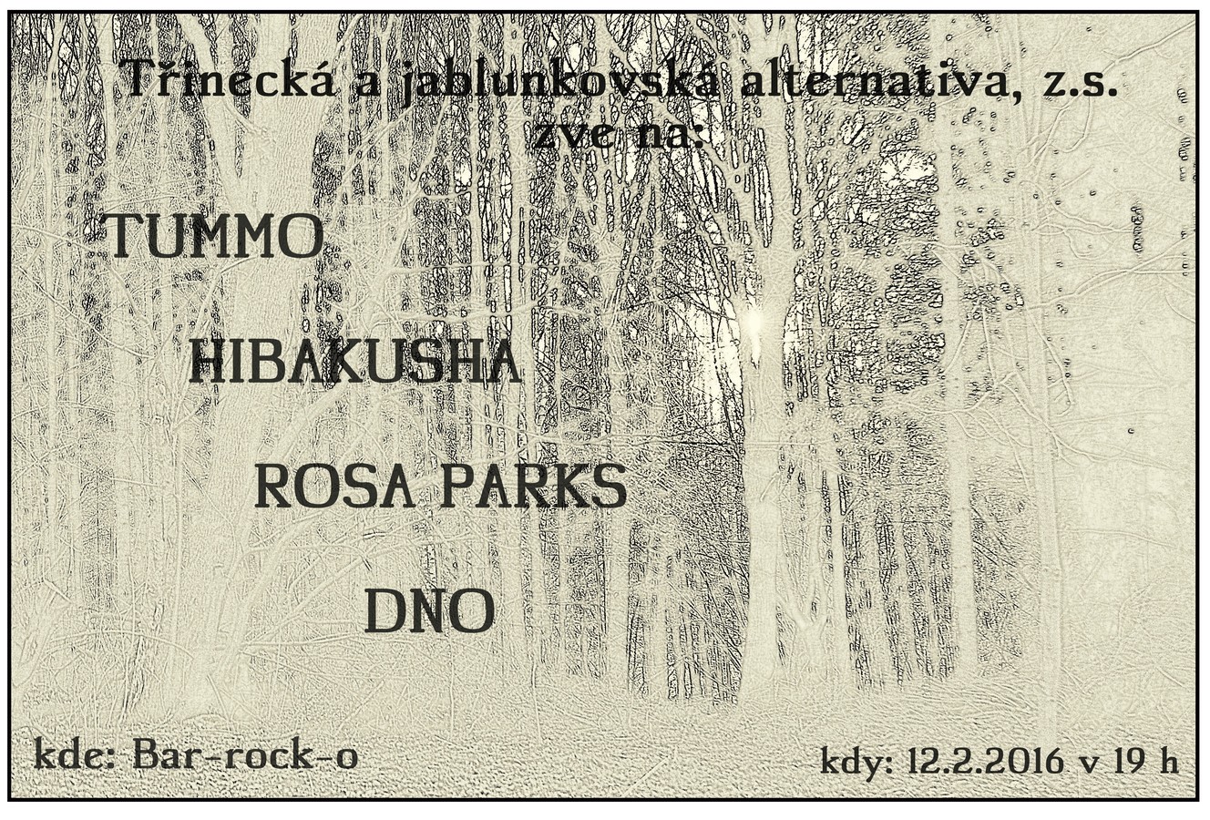 HIBAKUSHA - crust-grindová legenda (a to se nebojíme říct) z Orlové oslaví v příštím roce 20 let na scéně. TUMMÖ - Kapela se základnou v Brně vznikla v roce 2007 z členů kapel jako More Bad News, Ema Camelia, Gospel of the Future,Space to Being a dalších. Drsný a uřvaný stoner hardcore, kterému však nechybí ani rychlejší pasáže či podmanivě temné melodie, za nimiž jako by někde v dálce byla slyšet KYLESA. ROSA PARKS - Orlovský anarcho-HC/punk, který začínal před 11 lety pod názvem Extrudovaný výrobek a po několika změnách sestavy a určitém posunu stylu přejmenoval na Tupak Amaru a později Rosa Parks. DNO -Orlovský trojlístek doplní kapela DNO."Dno, kdybyste nevěděli, to je orlovská nová krev, jinak ale lidi z tamté a tamté kapely."(czechcore) Start v 19.00
