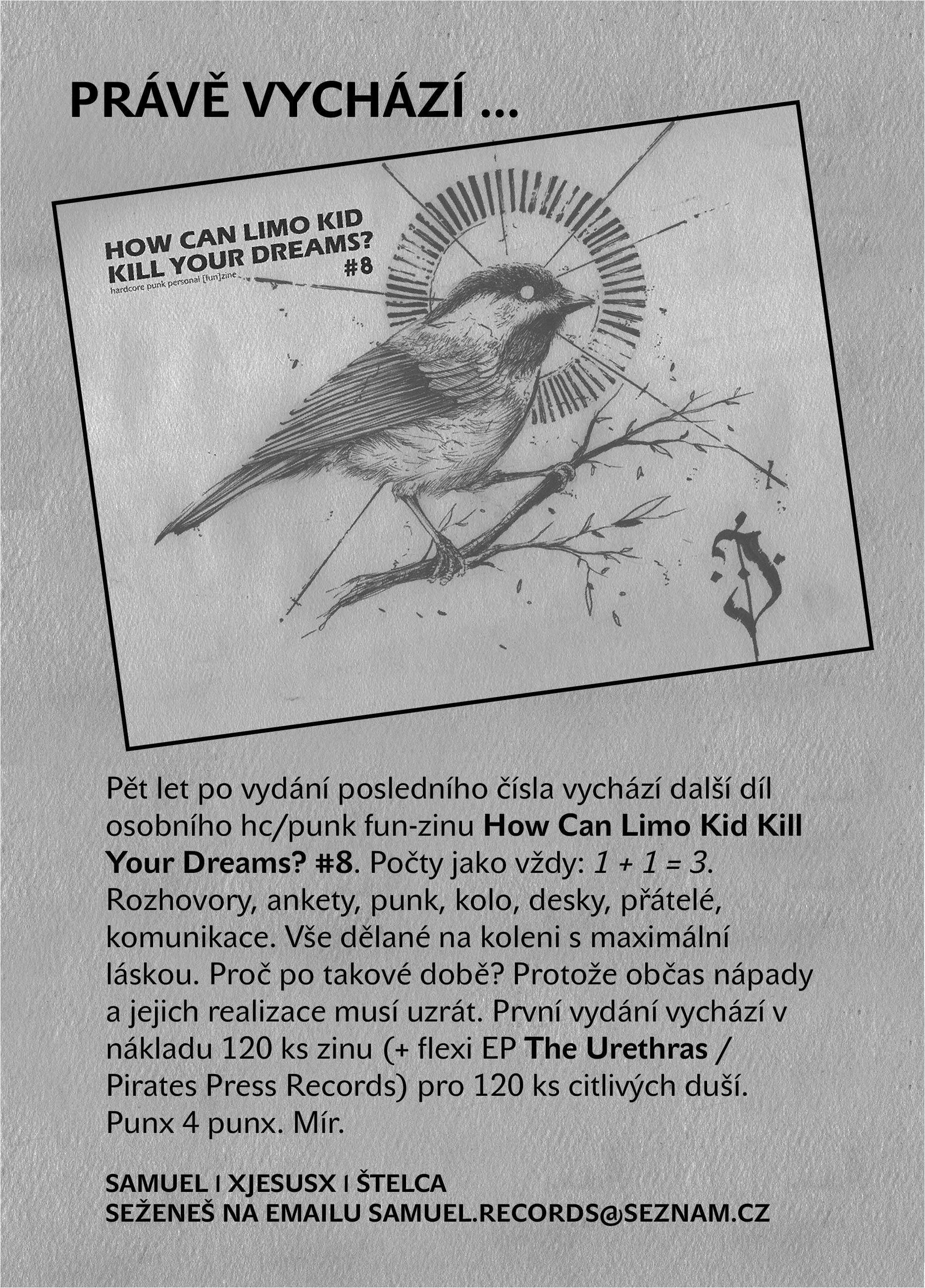 Pět let po vydání posledního čísla vychází další díl osobního hc/punk fun-zinu How Can Limo Kid Kill Your Dreams? #8. Počty jako vždy: 1 + 1 = 3 (Samuel & xJesusx & Štelca). Rozhovory, ankety, punk, kolo, desky, přátelé,komunikace. Vše dělané na koleni s maximální láskou. Proč po takové době? Protože občas nápady a jejich realizace musí uzrát. První vydání vychází v nákladu 120 ks zinu pro 120 ks citlivých duší. Formát jako obvykle A5, 84 stran, profi tisk a součástí zinu je flexi EP US kapely The Urethras (Pirates Press Records). Punx 4 punx. Mír. Objednávky na samuel.records@seznam.cz.