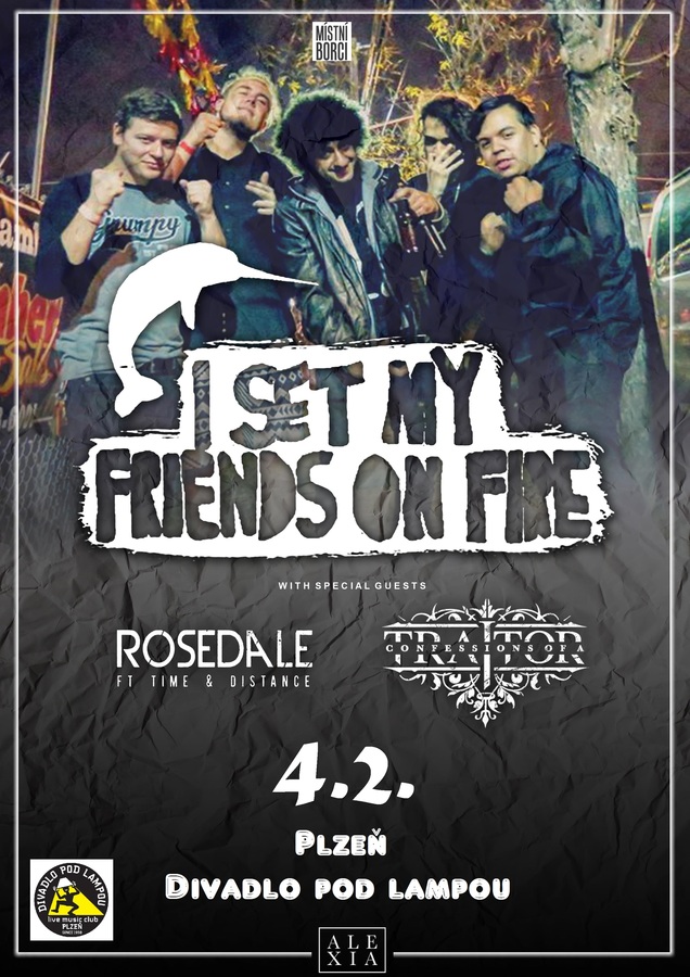 I SET MY FRIENDS ON FIRE /usa experimental / electronica / post-hardcore https://www.facebook.com/muzikanglisht/?fref=ts https://www.youtube.com/watch?v=UR6PBtPB7tw Ukázky: https://www.youtube.com/watch?v=vaQ_Csbrt8M&index=2&list=RDUR6PBtPB7tw https://www.youtube.com/watch?v=R_6ItxioUco https://www.youtube.com/watch?v=ZJQwKmzhS_8 https://www.youtube.com/watch?v=ba8CHRu1NLM ROSEDALE /can alternative rock / pop punk http://rosedale.bandcamp.com/ Ukázky: https://www.youtube.com/watch?v=awbS8xLViFA https://www.youtube.com/watch?v=ly5XCctaCVc https://www.youtube.com/watch?v=SPgH88f6iNU CONFESSIONS OF TRAITOR /uk hardcore / metal http://confessionsofatraitor.bandcamp.com/ Ukázky: https://www.youtube.com/watch?v=g8kqFws1Psk https://www.youtube.com/watch?v=leZVgu_tIqo (Pokud budete chtít, zajistíme divokou afterparty v některým z přilehlých klubů s některým z lokálních DJs.) Kdy: 4. 2. 2016 Kde: Divadlo pod lampou, Plzeň Lineup: TBA Start: 20:00 Vstup: 190,- na místě / 150,- v předprodeji (+ poplatky)