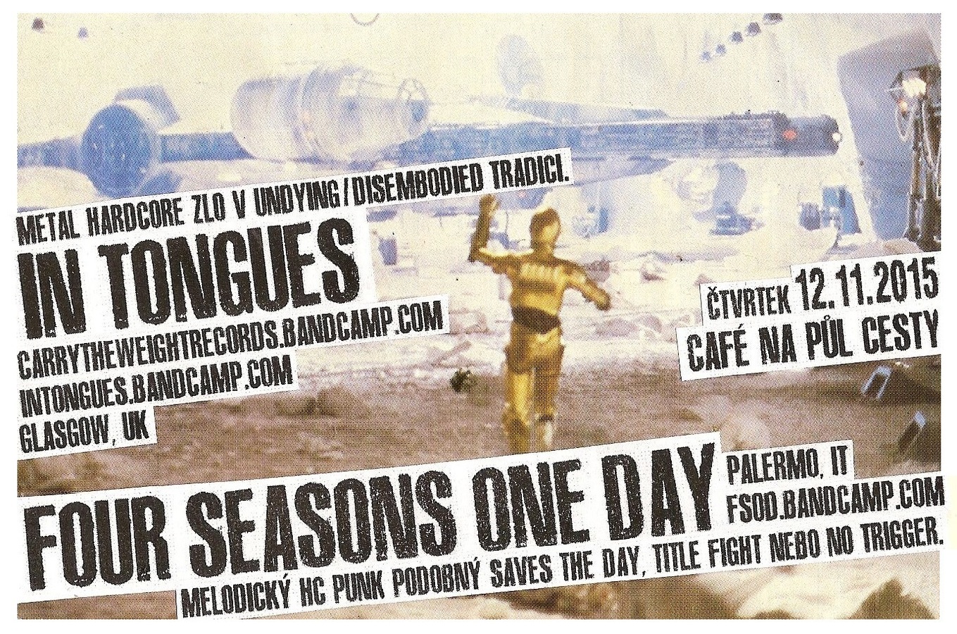 FOUR SEASONS ONE DAY jsou z italskýho Palerma a těžko si představit kapelu která je pořád hardcore a přitom hudebně odlišnější než In Tongues. tihle kluci hrajou melodickej hc/punk namíchanej s pop-punkem a moderním hardcorem. naživo jste je mohli vidět spolu s jejich staršíma kámošema z Onoda a pokud vás baví takovej ten poppy hc/punk ala Saves The Day, No Trigger nebo Title Fight, tihle kluci vás myslím nezklamou. a naživo jsou o 100% přesvědčivější než z nahrávek.