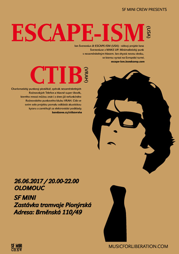 Ian Svenonius & ESCAPE-ISM (USA) - sólový projekt Iana Svenoniuse z MAKE UP. Minimalistický punk s nezaměnitelným hlasem. Ian chystá novou desku, se kterou vyrazí na Evropské turné. Ochutnávkou může být tohle video https://www.youtube.com/watch?v=vI7XTSKSqVw Ctib (Vrah) - charismatický punkový písničkář, zpěvák nezaměnitelných Rožnovských Telefon a hlavně super člověk, kterého mnozí můžou znát i z dnes již nefunkčního Rožnovského punkového klubu VRAH. Ctib ve svém solo projektu pomalu odkládá akustickou kytaru a zaměňujě za elektronické podklady. http://bandzone.cz/ctibzvraha Tram: zastávka Pionýrská Adresa: Brněnská 110/49