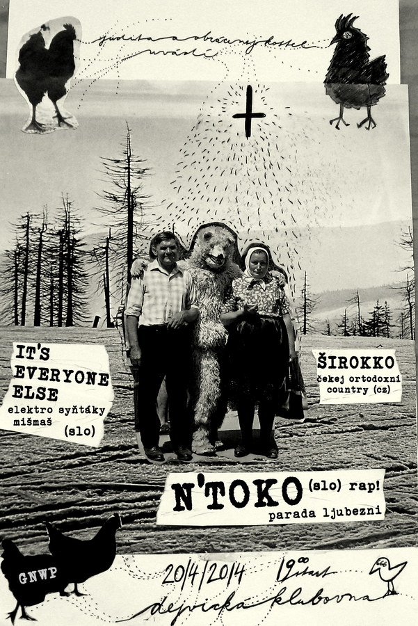 protože z toho večera mi zbylo jenom pár nesouvislejch fragmentů: Hlinomaz, kouř z aparátů a vypadlý pojistky (víc hudby jsem ten večer neslyšel), to, že mě Míra naverboval do sludge kapely, hektolitry vodky, výprava pro další hektolitry vodky, pár společenskejch fopátek a pak to, jak se bavíme s Haimim před klubovnou o tom, že když už děláme akci, kde se bude střetávat hiphop a elektropunk, jediný, co tomu schází, je poctivý staroškolský country. Vo Haimiho kapele nevim vůbec nic, v tý době ještě ani neměli název a slibovaný demo furt nikde. Jediný, co k tomu můžu říct je, že s timhle klukem se známe opravdu hodně dlouho a i když se nějak moc často nepotkáváme, ve většině záležitostí si rozumíme a na spoustu věcí máme podobnej náhled. Tim chci říct, že to nemůže bejt špatný, he.