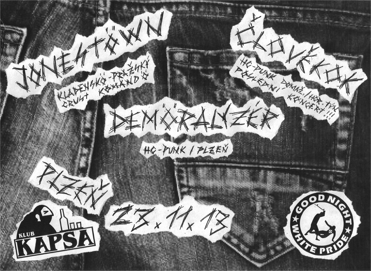 Kladensko-pražské crust komando, které to drhne už nějaký ten pátek… v obměněné sestavě, znovu v plné síle a se stále aktuální nahrávkou, která vyšla loni jako slit LP s ADACTA, Švédopal na plný koule! http://bandzone.cz/jnt ČLOVĚKOK Vegan diy hc-punk se dvěma navzájem se překřikujícími vokály, najdeš tu ty samí lidi, který měli prsty v kapelách DEMOLITION WORKERS a SHITBURGER. Vyvážená kapela, půl kluci / půl holky, půlka z Domažlic / půlka z Horšovského Týna, četružel tohle bude poslední koncert. http://bandzone.cz/clovekok DEMÖRALYZÉR Kde jsou ty časy, kdy DEMÖRALYZÉR hráli v Plzni každý druhý měsíc… po delší době můžeš tuhle čtyřku slyšet zas naživo, navíc s nově nahraným matrošem, který snad někdy vyjde na vinylu, hc-punk s odkazem na starý hc/punk/metal kapely. http://bandzone.cz/demoralyzer http://demralyzr.bandcamp.com/album/dem-ralyz-r-2013-ep