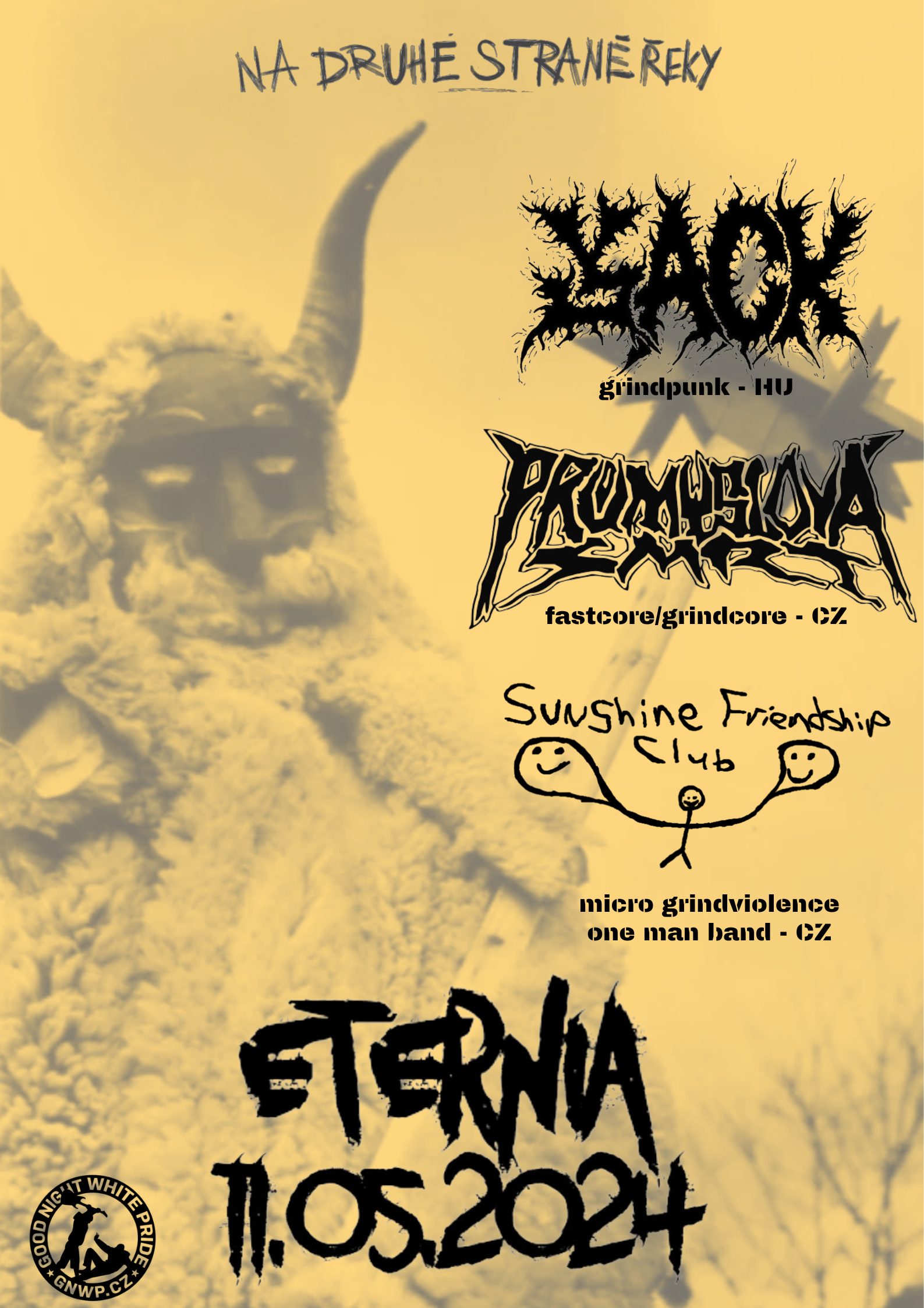 Sunshine Friendship Club (CZ) - Micro-grindviolence one man band, tomuhle se ani tak docela nedá říkat sypačka, protože tohle se ani nesype. Pásmo krátkých výkřiků Ti jen udělá díru do hlavy a zmizí tak rychle, že nebudeš vědět, co se to vůbec stalo. Tvrdý a rychlý songy v extra krátkém provedení, kde „texty“ jsou mnohdy kratší než samotný název.