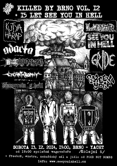 Se SEE YOU IN HELL letos máme 15 let a tradiční Killed By By Brno je ideální příležitostí, jak to oslavit. Na ohlídnutí za minulostí postačí jedna (delší) věta - odehráli jsme něco mezi 200 a 300 koncerty (už to dávno nepočítáme), vydali 3 velké desky a hromadu dalších hudebních nosičů po celém světě, šestkrát jsme byli na turné za oceánem, několikrát po Evropě, jako United Crusties jsme uspořádali okolo stovky akcí, od roku 2002 hrajeme v prakticky stejné sestavě (občas přišel a odešel 2. kytarista)... a nemuseli jsme při tom lézt do prdele žádným manažerům, organizátorům velkých festivalů, masmédiím a ani nikomu dalšímu. Na Killed By Brno jsme pozvali kapely, se kterýma se vesměs známe tak dlouho, jako existujeme, anebo kapely, ve kterých hrají lidi, kteří hráli dřív v kapelách, se kterýma jsme toho kdysi hodně odehráli.