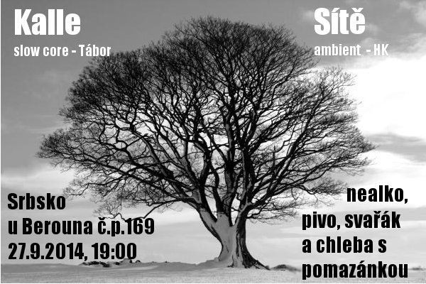 Faux pas krú se přestěhovala do Srbska u Berouna a tímto vás zve na kolaudačně-podzimní koncert na dvorečku. K depresivnímu podzimu byly vybrány dvě kapely – Kalle a Sítě. Kalle je slow core, kterej ale je pro mě obrovsky hozenej do trip hopu. A jsou to neskutečně šikovný lidi, kteří si vystačí jenom s hlasem a kytarou a několika krabičkama na smyčky. A zní to neskutečně dobře…podle mě tak, že za pár let tahle kapela asi na dvorcích lidiček hrát nebude (anebo třeba bude). A tady nějaký audio http://kallesound.bandcamp.com/album/live-from-the-room-3 Sítě je kapela s jedním členem dua Tomáš Palucha. Podle tohohle popisu je jasný, co čekat – pomalost, skvělý vybrnkávání, meditaci, klid...je to fakt neskutečně atmosférická hudba. Navíc každej koncert originál, improvizace, takže se strašně moc těšíme. Zde k poslechu http://sitesitesite.bandcamp.com/ Srbsko u Berouna je taková krásná vesnice v Českém krasu, jezdí sem vláčky z Prahy hlavního nádraží a ze Smíchovského nádraží. Začínáme v 19:00 přesně a končíme ve 22:00, protože tam máme i nějaký sousedy a my bychom tam ještě chvíli rádi bydleli. Poslední vlak do Prahy jede v 22:53, ale pokud si vezmete spacáky, tak se dá i přespat. Bude takovej minimalistickej bar – nějaký čajíky a kafe, svařák, lahváče a chleba s veganskou pomazánkou. Náš baráček je na adrese Srbsko 169 – Hrašov. Od nádraží přejdete most, půjdete nahoru směrem na Bubovice, ale hned u obchodu odbočíte doprava do krpálu Po asi 200 m odbočíte doleva do ještě většího krpálu a na samém konci asfaltky po levé straně stojí. Asi tam stejně dáme nějaké šipky. A vstupné bude 100 káčé.