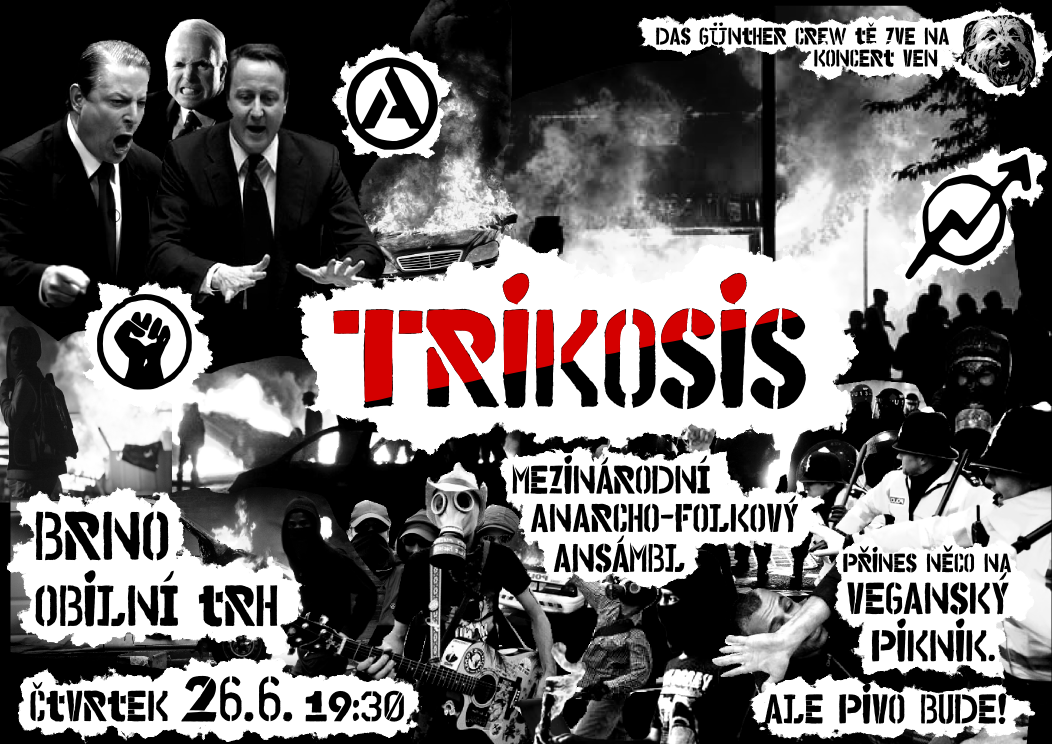 Trikosis vyrážejí na turné z Holandska, je to ale pestrá mezinárodní směsice. Sedm lidí z rozličných koutů světa se potkalo na jedné osquattované farmě. Založilo tuto jedinečnou kapelu, ve které se mísí celá řada hudebních žánrů, od klezmeru a balkánu až po punk a ska. A vyrazili na turné po Evropě. Hudebně připomíná starší tvorbu Chumbawamby, ovšem Trikosis jsou daleko intenzivnější a nespoutaní.