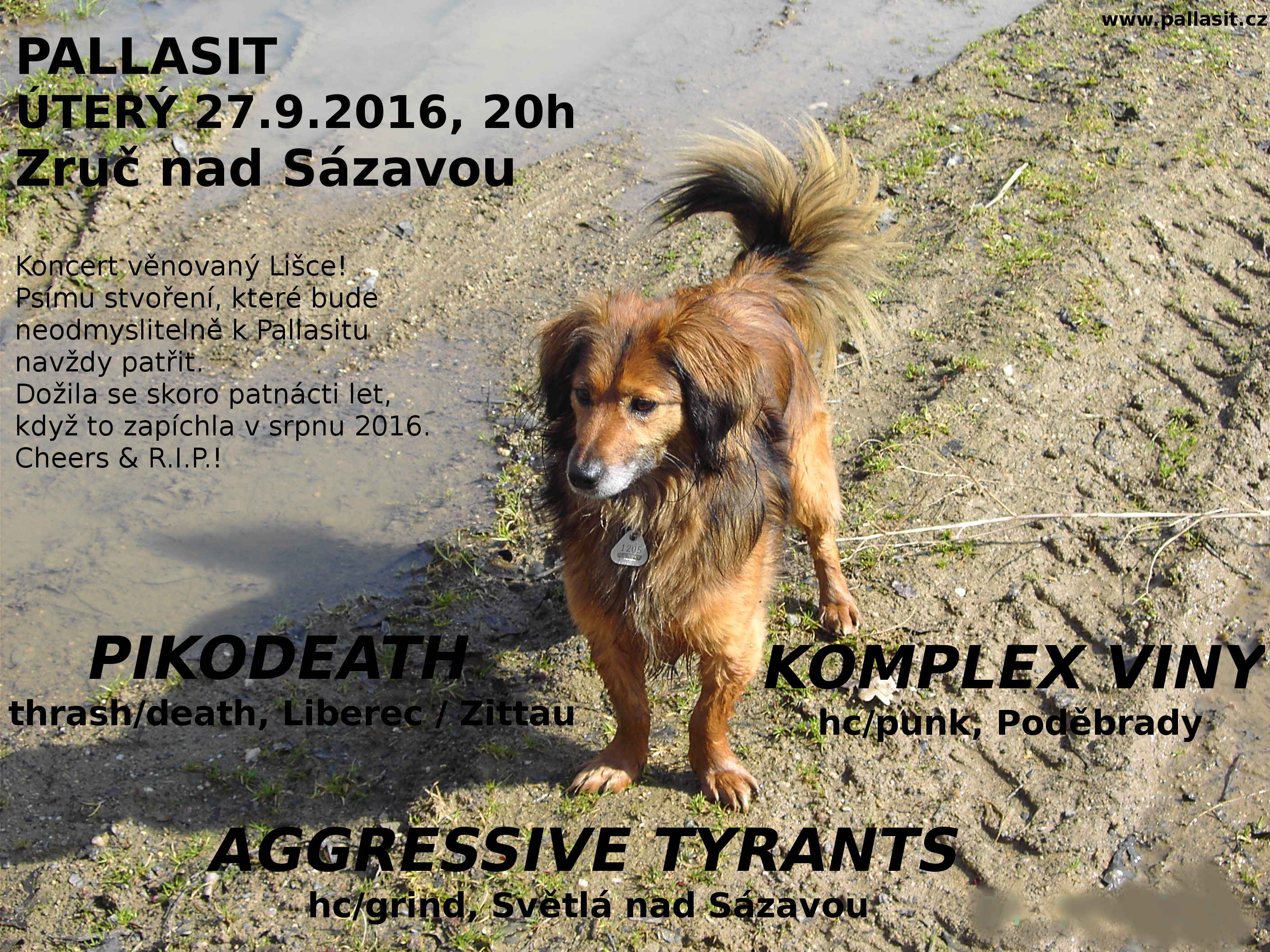 Koncert věnovaný Lišce, psímu stvoření, které k Pallasitu neodmyslitelně patřilo a navždy patřit bude! Dožila se skoro patnácti let, když to v srpnu 2016 zapíchla... Cheers & R.I.P.