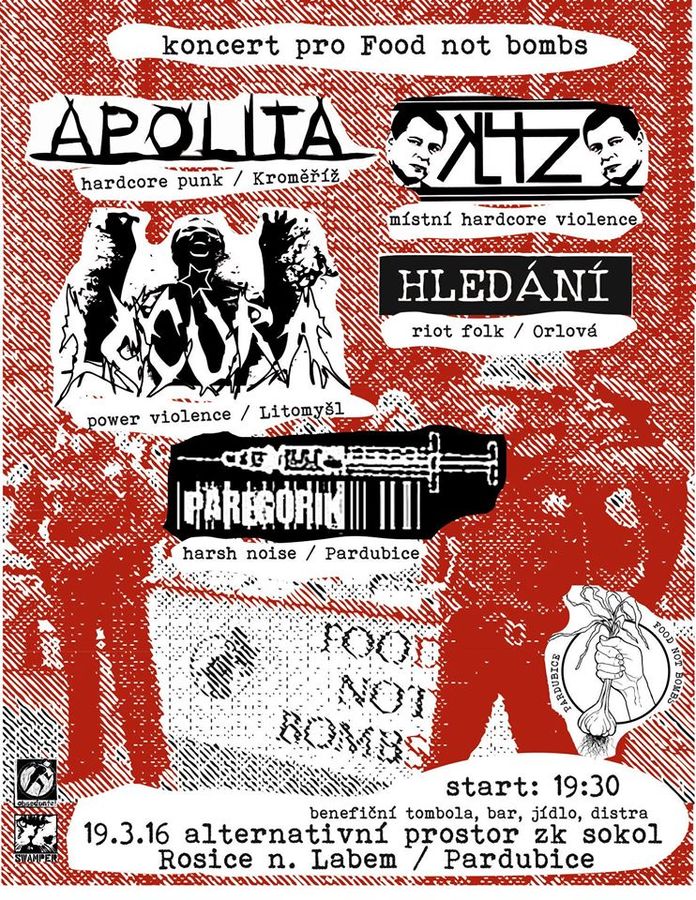 APOLITA https://apolita.bandcamp.com/ DIY punk against racism, sexism, homophobia and other forms of oppression. LOCURA http://bandzone.cz/locura Rychlý, uřvaný, angažovaný power violence / grindcore KLVTZ https://kuklutz.noblogs.org/ Obsedantně zablácený hardcore violence, který kope za ZK Sokol HLEDÁNÍ https://hledani.bandcamp.com/ Anarchist vegan folk punk, deeply rooted in diy hc/punk scene PAREGORIK Harsh noise Pardubice www.paregorik.bandcamp.com