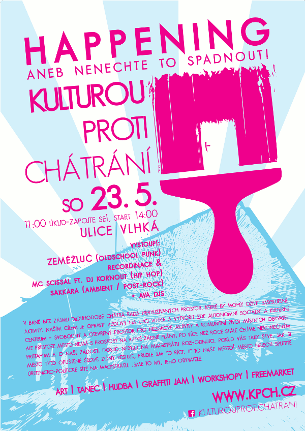 Na happeningu 23. května, který se bude konat u chátrajícího areálu na ulici Vlhká, vyzveme město, aby s takovou praxí přestalo a umožnilo občanům svobodně oživovat městské prostory, které nemají jasné využití. Chceme podpořit vznik autonomního sociálního a kulturního centra v Brně (ať už na Vlhké, nebo jinde), stejně jako další podobné aktivity, které směřují k oživení veřejného prostoru a chátrajících budov. Město nejsou spletité úřednicko-politické sítě na magistrátu, jsme to my, jeho obyvatelé. Pokud vás štve, jak si město tyto opuštěné šedivé zóny pěstuje, přijďte jim to říct. Je to naše město.