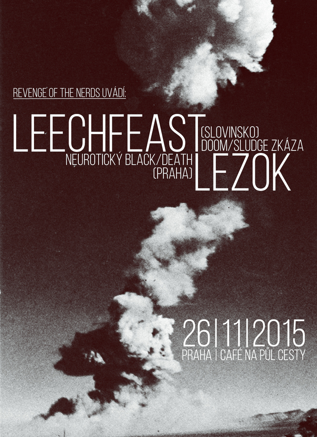 Z tohoto koncertu má Pomsta šprtů fakt radost. +++LEECHFEAST+++ podle našeho názoru to nejlepší z evrospkého sludge/doomu. za sebou několik nahrávek včetně samostatného lp a splitů s meth drinker nebo marnost. nová deska na obzoru. členové paperplanecrash, melete, landverraad, crevasse... pozor, bude to hodně nahlas https://leechfeast.bandcamp.com/ +++LEZOK+++ divnej metal v tom nejlepším slova smyslu. Začátek klasicky po 20:00, konec do 22:00. V café na půl cesty se vevnitř nekouří. Vybíratz budeme dobrovolné vstupné. Dobrovolné vstupné neznamená, že je koncert úplně zadarmo, kapely se potřebujou aspoň najíst a taky potřebujou peníze na palivo a dodávku, aby na turné neprodělali vlastní kalhoty. Myslíme si, že adekvátní a fér příspěvek je 100-150 Kč, ale pokud je to na tebe moc a můžeš dát míň nebo nemůžeš dát nic, tak je to samozřejmě ok.