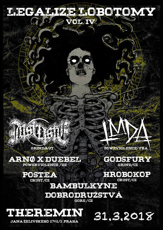 LEGALIZE LOBOTOMY vol. IV. Distaste - grind/AUT Napálená těžkotonážní grindovka z rodiny středoevropských likvidačních kapel často s "dis" na začátku a "e" na konci, takže masakr jako Implore, Six-Score či Discure, který pokud máš v oblibě, tak tady nemůžeš chybět! https://distastegrind.bandcamp.com/ LMDA - powerviolence/noise/grind FRA Tenhle masakr ovšem nezůstane Distaste nic dlužen, jedná se o netradiční PV řizlý až noiserockovýma pasážema. Tudíž čekejte extrémní nasazení od začátku do konce, palby, ale i nekompromisní chrčící zvuk jak pásy tanků! https://lmdapowerviolence.bandcamp.com/album/le-mal-des-ardents-s-t Arnø x Duebel - powerviolence, DE Tihle Němci naopak přistupují k PV z čistě hardcore-punk pozic, budou sypačky versus skákačky, to ale nikdy neomrzí! https://arnoxduebel.bandcamp.com/album/split-w-disparo Godsfury - grindcore CZE Brutální palba z Jižních Čech, kde se jak známo hodně jede Terrorizer style http://bandzone.cz/godsfury Bambulkyne Dobrodružstvá - vychrochtaný rock'n'roll CZE Tanečky, kopačky, lítačky, vyměšovačky, dáte si večerníček? ;-) http://bandzone.cz/bambulkynedobrodruzstva Postea - neocrust CZE Hlubší a promyšlený neocrust ala Tragedy, právě když tohle píšu, tak nahrávají album! http://bandzone.cz/postea Hrobokop - metallic crust CZE Po delší pauze se tato pražská špína vrací na scénu s pozměněnou sestavou, připomene vám, že nemá smysl utíkat hrobníkovi z lopaty! https://www.youtube.com/watch?v=YuXMKDphXtA Pravděpodobně bude i acid tekk afterparty v podání Olgoj Chorchoj Sound System, upřesníme! Vstup jako obvykle férové 150,-, jestli nemáš, sněz skleničku plnou hřebíků a pustíme tě!