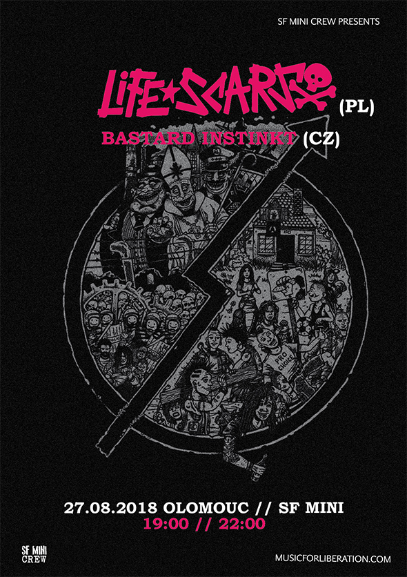 Life Scars (PL) - Deset let, tři alba a mnoho koncertů na krku, mimo jiné tour po Grúzii, Arménii a Ázerbajdžánu. Politický hardcore punk a pocta klasickým polským kapelám jako Post Regiment, Trompka Pompka atd. v podání lidí, které můžete znát ze smeček jako All Day Hell, Social Crisis, či díky jejich aktivitám kolem bývalého squatu Zakaźny nebo labelu Up The Punx! lifescars.bandcamp.com