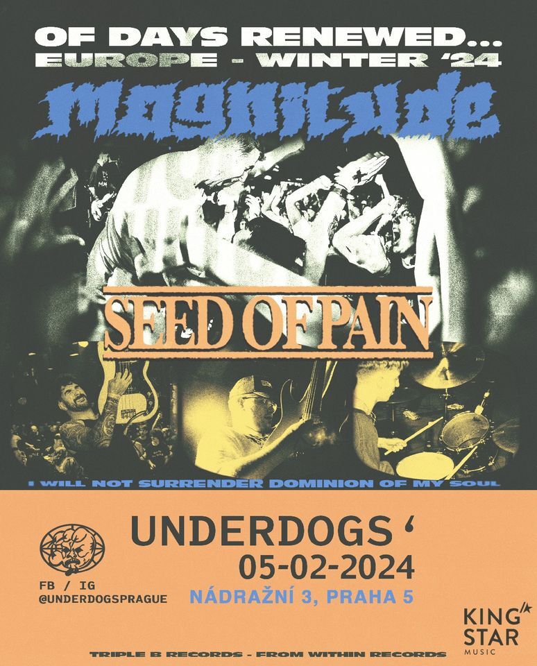 MAGNITUDE, hc straight edge pětice ze Severní Karolíny se vrací do Underdogs'. Těšit se můžeš mimo jiné na nové bomby z druhého alba Of Days Renewed..., které vyšlo loni na podzim u Triple B. Na turné se Magnitude vydávají s floridskou partou SEED OF PAIN.