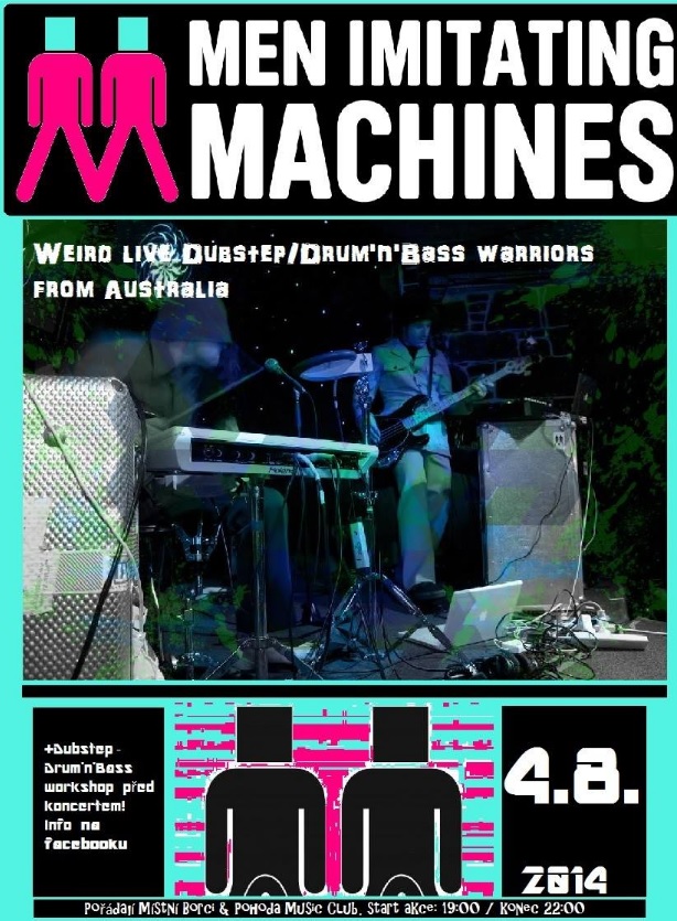 Men Imitating Machines je prapodivné live Dubstep/Drum'n'Bass duo z Austrálie co se rozhodlo přetavit inspiraci elektronikou do živý podoby. A pár let už dokazujou, že jejich úspornej setup skládajcí se z midi basy, midi bicích a dvou laptopů rozhejbe zaručeně každýho čumila či kejvače. Jednim slovem strhujcí a čistá zábava. Na kontě maj 3 EP a v létě letí na svým koberci Evropou a přistanou i v Pohodě, roztančit vaše ztvrdlá hýždě (autokorekce)