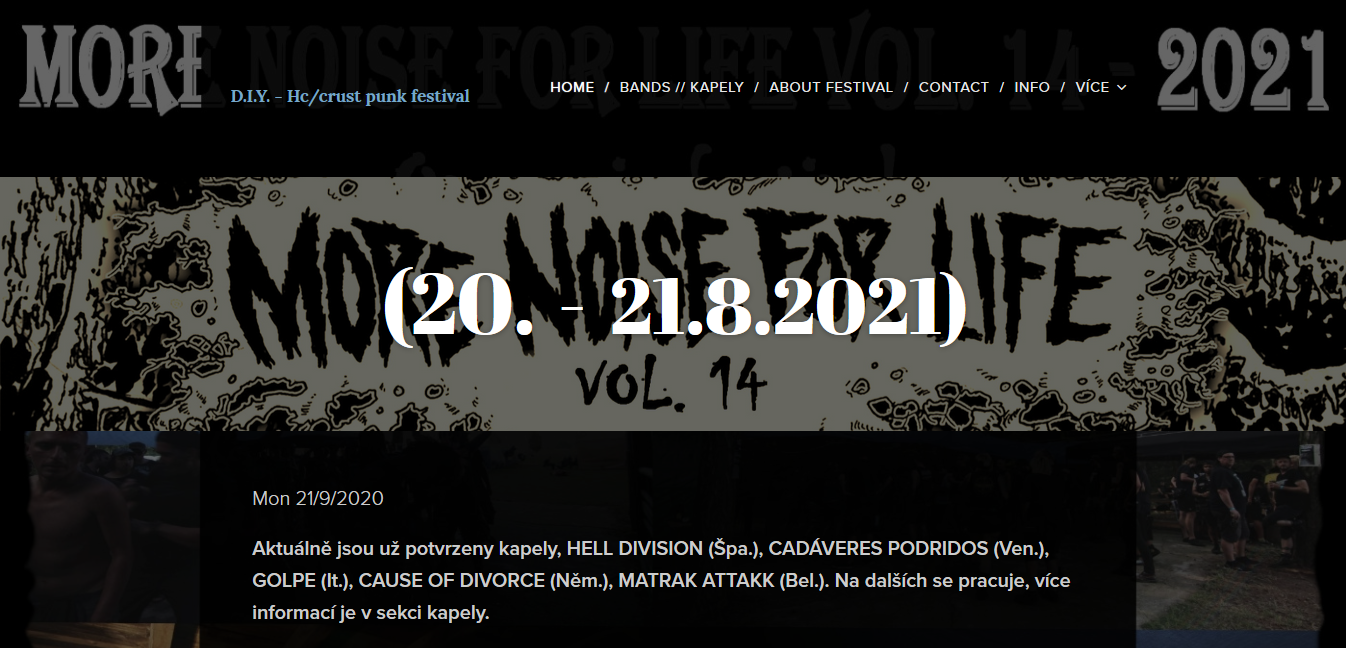 Můžeme oznámit další edici hlučného prostředí. MNFL Festival má nový WEB, kde najdeš veškeré potřebné info, některé kapely jsou již potvrzené a další budou postupem času přibývat, pracuji na tom, tak jak máme rádi raw hc/crust punk, žádný slaďárny v tento datum 20. - 21. Srpna 2021.