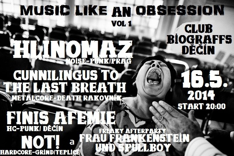 Hlinomaz - noise-punk, který vám roztáhne zorničky http://beatzone.cz/component/kapela/Hlinomaz Cunnilingus to the last breath - Cundiny jsou zpět s ještě rychlejšíma sypačkama a temnějšíma vokálama http://www.cunnilingus.cz/ Finis Afemie - domácí divoženky a jejich nature ukřičenej hard-core http://bandzone.cz/finisafemie?at=info NOT! Na první pohled hodni chlapíci to maj rádi fast a nebojej se nám to předvíst http://bandzone.cz/not?at=info a jako třešnička na dortu FRAU FRANKENSTEIN UND SPÜLLBOY ... Brno vrací úder start 20:00 na místě bude jako tradičně něco k jídlu vstup: bude! posílej, sdílej a hlavně ... DORAŽ :) ! ....Xenofobové, týrači psů, pruďaři a jiný nenávistivci nejsou vítáni....