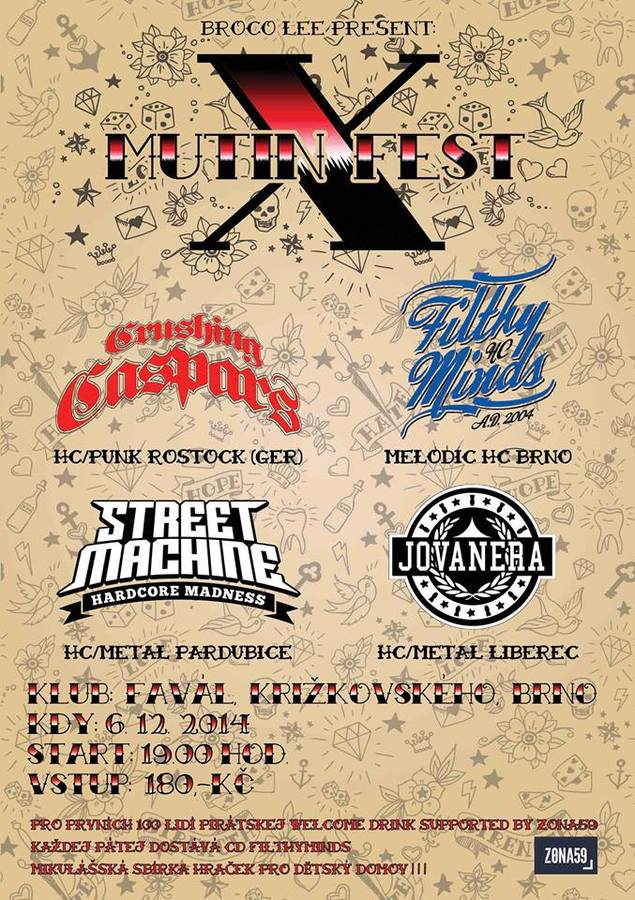 Jubilejní desátej ročník hc akce pořádanej kapelou Filthyminds pro kamarády a všechny milovníky tohodle stylu se vrací tam kde to všechno začalo – na Favál. Letos je to přesně 10 let od vzniku naší kapely a potkávali jsme se tenkrát všichni právě na Favále. Přes všechny změny v sestavě, stěhovačky, procesy rovnání si důvodů proč vlastně hrajeme a životních hodnot celkově a přes všechno dobrý i špatný jsme pořád tady a děláme to co nás baví a pro lidi, který to baví. Tahle speciální akce je zároveň zastávkou na turné CRUSHING CASPARS a STREETMACHINE. Obecně platí, že na koncerty kdekoliv po ČR chodí pořád míň lidí a má to svoje celkem pochopitelný důvody, ale i tak věříme, že na Mutin Fest 10 se zahraniční kapelou tohohle kalibru se nás sejde dost na to, aby z toho byl pro všechny parádní večer a zážitek a aby jsme neprodělali gace :-)