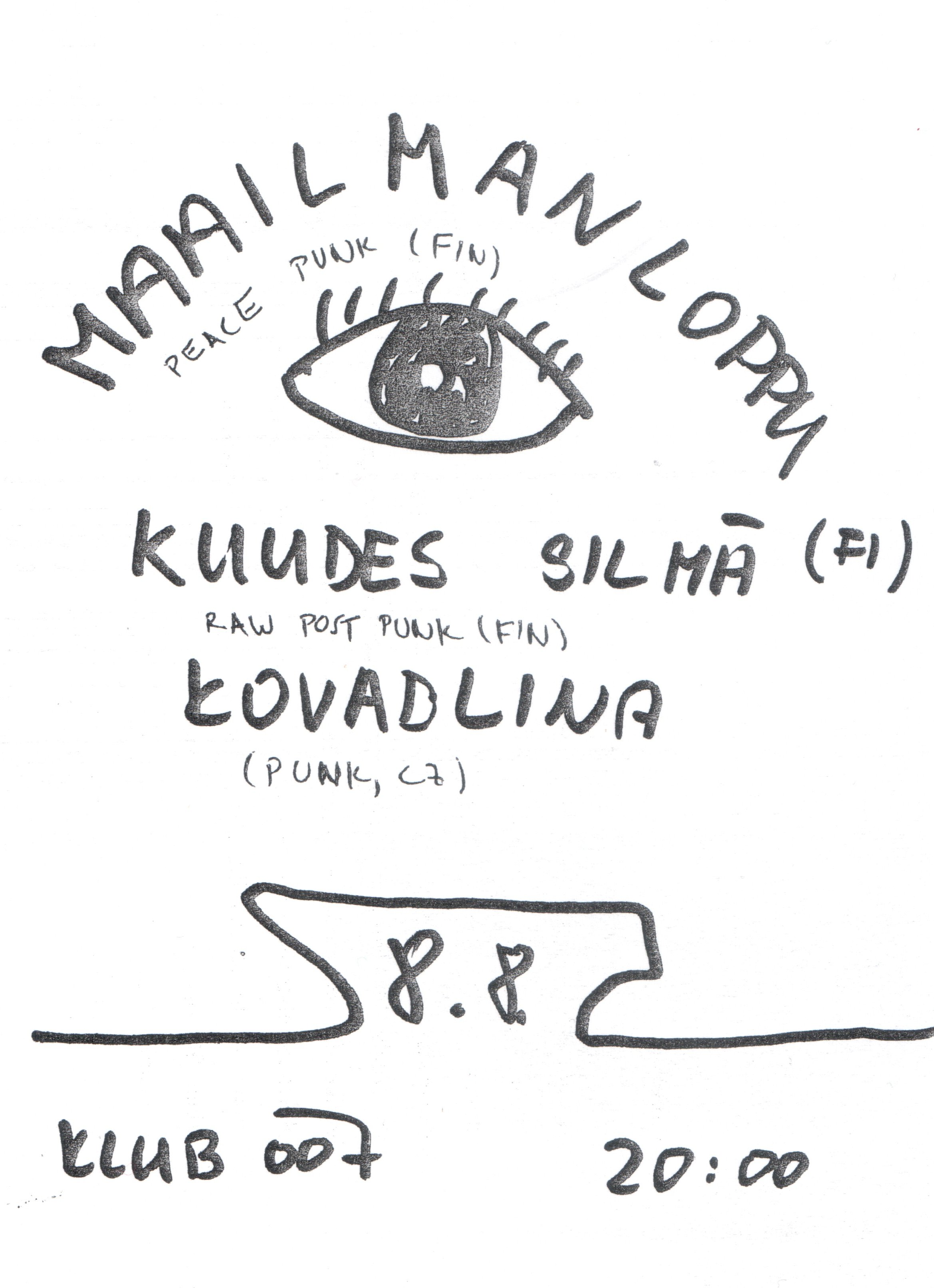 MAAILMANLOPPU (Konec světa) přijíždí již po třetí do ČR představit svůj geniální mix post punku a finopalu alá 82'. Kapela se hrdě hlásí ke svému domovskému městu Kouvola, které je označováno jako nejnudnější místo ve Finsku. A možná i proto je Kouvola líhní výborných kapel – např. Kirous, Kivesveto Go-Go, Kakka-Hätä 77, Pää Kii... Ústřední postavou MAAILMANLOPPU je Aleksi, který předtím zpíval v DEATH WITH DAGGER, kteří se přes ČR také několikrát prohnali. Aktuálně Aleksi ještě drtí basu v KOHTI TUHOA, což je masakrální hardcore. Obě Aleksiho současné kapely budí ve Finsku maximální respekt, velmi aktivně koncertují a vydávají desky. Debutní LP MAAILMANLOPPU je beznadějně vyprodané a od té doby vychrlili 7 singlů, včetně výborného splitka s KUUDES SILMÄ (Šesté oko) a neméně skvělého 12ti palce Täältä Tulee Sota, na kterém jsou (jen) 4 dlouhé songy temného post punku. Už jsem myslel, že na rychlý punk rezignovali, když tu se letos vyloupl nový singl Ansassa, který opět jede starý dobrý, rychlý finopunk, který dává skvěle vyniknout krkolomné mateřštině. Střídání dvou odlišných stylů je skvělý, v punku poměrně ojedinělý koncept.