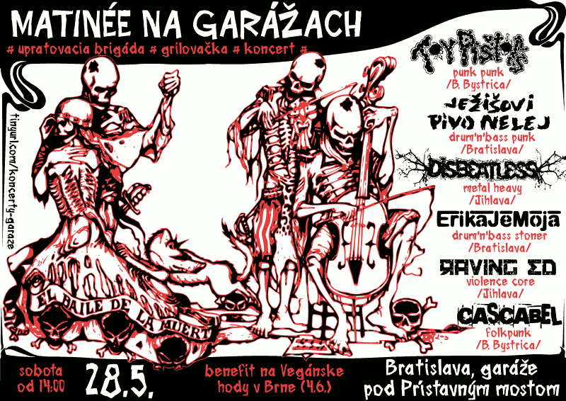 Než vypukne leto naplno a na garážach sa bude dať fungovať až po západe slnka, skúsime si tam dať piknik už poobede. A že sme pankáči, trochu pri tom skrášlime okolie, nech tam naša špinavá muzika lepšie vynikne. Plán je nasledovný: -Kto môžte, dojdite už o druhej; my donesieme nejaké vrecia a rukavice a spolu skúsime dosiahnuť, aby sa počas koncertov dalo v tráve sedieť aj za triezva. Kolektív brnenských Vegánskych hodov nás k tomu bude zásobovať kávou, dobrotami a nejakou motivačnou hudbou. -Za odmenu nám potom zahrá pár spriatelených kapiel, ktoré všetci radi uvidíme pokope. A to konkrétne JEŽIŠOVI PIVO NELEJ, drum'n'bassoví rýchlopunx, ktorým prístavné garáže už dlhé roky poskytujú otvorenú náruč, a oni si z toho stále berú len to horšie. Alebo lepšie, posúdiť môžte aj z čerstvo vydaného split LP s tiežprítomnými ERIKA JE MOJA. Ani im ku šťastiu nechýba gitara, ale narozdiel od JPN svoju hypnotickú hlukovú stenu drtia pomaly. Veľmi pomaly, ale nežne nie. Z drsných kopcov českomoravskej Vysočiny prídu DISBEATLESS, ktorým ste párkrát pripravili divoké uvítanie ešte v Oblude. Na svoj vycibrený crust-metal odvtedy nabalili ešte viac metalu, nutno povedať že k prospechu veci. No a s veľkými nádejami budeme očakávať TOY PIŠTOĽS, a to nielen preto, že v Bratislave hrali naposledy v roku 2003 a odvtedy sa uskutočnilo už niekoľko neúspešných pokusov ako ich sem dostať znova. Doby srandovného alkopunku sú dávno preč, tešte sa na jednu najkvalitnejších punkrockových kapiel u nás, a to ako po hudobnej tak po textovej stránke. -Line-up dodatočne doplnili ešte 2 kapely: banskobystrickí CASCABEL, ktorí hrajú melodický folkpunk plný energie a neboja sa k tomu použiť i hudobné nástroje, ktoré u nás zas až tak bežné nie sú. No a ak aj nie ste fanúšikovia grindu, hardcore či powerviolence, dajte šancu kapele RAVING ED z Jihlavy, pretože tí tieto štýly miešajú s neuveriteľnou ľahkosťou, ktorá prinajmenšom rozkýve hlavy nejednému nezbednému publiku. A nie je dôvod nazdávať sa, že by na zrovna na garážach odozvu nenašli, naopak - myslíme si, že to bude divoké! -Brnenské Vegánske hody na akcii nebudú zastúpené náhodou, a gril si so sebou nedovezú nadarmo. O týždeň neskôr, v sobotu 4.6., sa v Brne uskutoční už druhý ročník Hodov a organizátori vám prídu dokázať, že o takomto výlete sa oplatí uvažovať. Výťažok z matiné bude benefičný práve na nich a verte tomu, že urobia všetko preto, aby ste si túto sobotu chrumky na pumpe kupovať fakt nemuseli (a ani nechceli). -Keďže budeme začínať skoro, môžme skoro aj skončiť. Kľudne si po desiatej spravte ďalší program, s policajnou hliadkou sa tentokrát asi nebude treba hádať. Jedine že by sa nám chcelo. Vegánske Hody Brno: http://brno.veganskehody.cz/ TOY PIŠTOĽS punk punk /B. Bystrica/ http://www.toypistols.sk/ DISBEATLESS metal heavy /Jihlava/ http://bandzone.cz/disbeatless ERIKA JE MOJA drum'n'bass stoner /Bratislava/ http://bandzone.cz/erikajemoja JEŽIŠOVI PIVO NELEJ drum'n'bass punk /Bratislava/ http://bandzone.cz/jezisovipivonelej CASCABEL folkpunk /B. Bystrica/ http://bandzone.cz/cascabel RAVING ED violence core /Jihlava/ https://www.facebook.com/ravinged/ Sobota 28.5.2016 od 14:00 Bratislava, Garáže pod Prístavným mostom http://tinyurl.com/koncerty-garaze FB udalosť: https://www.facebook.com/events/1715961198685102/