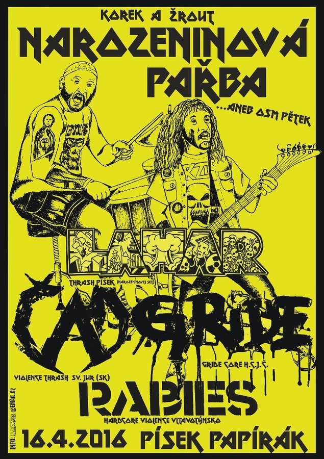 RABIES – noise/violence/hardcore, Vltavotýnsko http://bandzone.cz/ rabiesvzteklina Jako první zřejmě odstartují večírek kolem 20 hodiny RABIES. Komando noise/violence /hardcore nadšenců z Vltavotýnska. Jejich noisecore začátky jsou datovány rokem 1996, tedy před 20 lety. Neskutečný!!! Na svém kontě mají kolem 40 releasů, ...převážně na nejrůznějších splitech , kompilačkách a 7“ vinylech a to s kapelami z celého světa (např. s Kolumbijcema CHULO nebo Španělákama Disturbance Project a nebo také s ČAD). Všechno striktně v duchu D.I.Y. Pamětníkům z Paluby není nutno představovat. Kdo neviděl žádnou Sykyho fotku nebo nečetl Šakalovo Noise master zine, jako by nebyl. Třešnička z Lahar archivu na závěr: Poprvé spolu hráli Lahar a Rabies (a zároveň i Gride)v Berouně 26.7.2003.