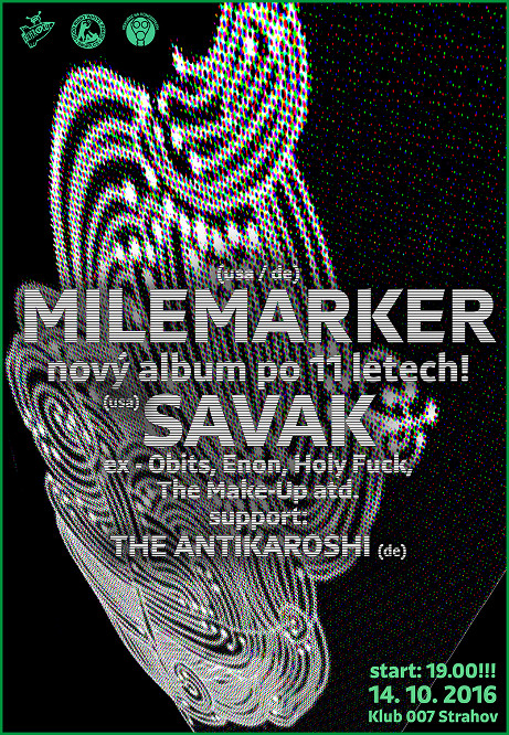 ANO! Milemarker jsou po více než deseti letech zpátky! Nová deska "Overseas" vyjde v srpnu, repress kultovního alba "Frigid Forms Sell" je venku už teď. Význam týhle kapely je větší a větší, jak postupuje čas. A Dave Laney s Alem Burianem znova na jednom pódiu? Nejvíc! To ale není všechno: v Savak najdete lidi z Obits, Enon, Holy Fuck, The Make-Up, French Toast atd... Letošní LP "Best Of Luck In Future Endeavors" zní fantasticky a jsme velmi VELMI rádi, že se tyhle kapely představí společně 14. října právě na Sedmičce!