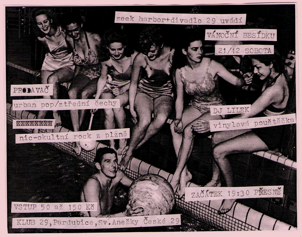VÁNOČNÍ BESÍDKA V KLUBU 29 s PRODAVAČ /pop/ a ██████ /occult rock/ + DJ LILEK /pouštěčka/ P R O D A V A Č /// CZ / STARCASTIC RECORDS /// Akutní otrava chytlavostí, záruka toho, že se domů vrátíte bez partnerky anebo až přespřílišné manění při poslechu uhrančivých kytarových sól. Takhle by se dala zhruba popsat rizika hrozící z návštěvy koncertu středečeské čtveřice PRODAVAČ. V ní se sešel Šampón (z kultovních Sporto), Pek.lo (multiinstrumentalista z kapely SEBESTŘET, BLACK TAR JESUS, BONUS, KOMUNISTI), Kluk (JIŽNÍ PÓL) a nikdo menší než Stejky (GORO, BTJ!!). Prodvač rozdává rány s mírnou nepravidelností, ale s o to větší intenzitou. Jejich debutní EP Duchové (ke stažení zdarma na stránkách Starcastic viz http://starcastic.cz/bands/prodavac/) přineslo slušnou porci chytlavého popu s břitkou hitovostí, servírováno v pěti chodech. Netrpělivě očekávané pokračování v podobě desky už je na cestě. Platí ale jedno: Prodavač chutná nejlépe na živo!! https://soundcloud.com/p-r-o-d-a-v-a-c/jak-je-barva-tvoj-noci-iv ██████ /// CZ / STONED TO DEATH / DAY AFTER /// V kapele pofiderně známe jako NIC anebo "nicka" se sešla pětice punkových veteránů z Plzně a okolí Starého Plzence. Členové úderek jako SOVIČKY, BARREL anebo K-LXM se rozhodli podrobit svoje zápěstí trochu náročnější výzvě a trojici kytar teď prohání poctivým black metalovým včelínem. Tahle perla plzeňského okultního rocku, která v lečcems připomene vlnu amerických eko-black-metal kapel, se v Pardubicích objeví úplně poprvé a copa my tady s nima, ne? DJ LILEK /// CZ / STONED TO DEATH /// Money na 45rpm. ----- LINE UP: 19:45 PRODAVAČ 20:45 ██████ 21:45 DJ LILEK ----- Přijďte na čas, živá hudba musí ideálně zkončit v 21:30!! Vstupné dle vašeho uvážení v hladině od 50 do 150 Kč.