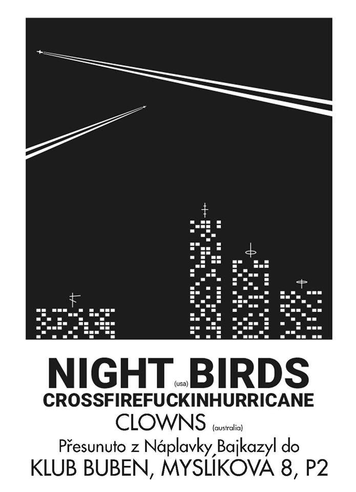Vzhledem k předpovědi počasí (3 stupně nad nulou, vítr a nevypočitatelné přeháňky) se koncert Nighg Birds a spol přesouvá do Klubu Buben v Myslíkově ulici. Start ve 20.30, vstup 150 kč a kouřit se bude venku. Díky za pochopeni!!!!
