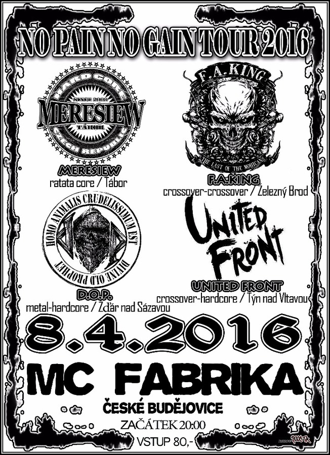 Na rok 2016 je naplánované turné čtyř stylově zpřízněných bandů s názvem NO PAIN NO GAIN TOUR 2016. Kapely: Meresiew, United Front, D.O.P., F.A.King. V rámci tour se odehraje osm koncertů na Vysočině, severu a jihu ČR. Koncerty plné nasazení a energie. V pátek 8.4. 2016 v českobudějovické Fabrice.