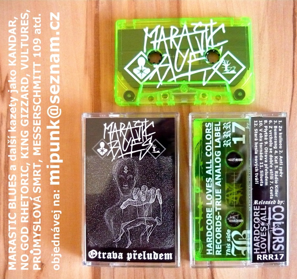 Kazeta MARASTIC BLUES - "Otrava přeludem" je venku !!! Jihomoravští grindeři MARASTIC BLUES přicházejí s novou deskou a je to masakr! Očekávej nápaditý riffy, bezchybnej bicí kulomet, vychytaný baskytarový linky s tunou vyhrávek a nadstandartně promakaný víceřevy a máš to z Dobronic doma! Hoď do hrnce raný GRIDE, raný LYCANTHROPHY, dokořeň HIBAČKOU a dosol PRŮMYSLOVKOU - a přidej řáckej kus jihomoravskýho temperamentu, a "Otrava přeludem" tě dostane! Vychází na HARDCORE LOVES ALL COLORS records, s full bukletem s texty a potištěnou kazetkou - vypadá to supr a zní ještě líp! Objednávej na mipunk(dot)seznam.cz.