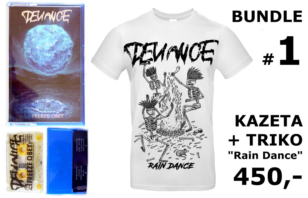 DEVIANCE jsou tady! Tahle excelentní mladá thrash metalová partička z Brna sází jeden famózní riff za druhým, dokáže složit promyšlený, nápaditý a dramatický skladby s na místní poměry netradičním vokálem, a navíc s obrovským bonusem - DEVIANCE dokáží napsat i naprosto excelentní a žánrově velice zajímavý a netradiční texty! Suma sumárum - stylově se vracíme do roku 1984 a pokud vzpomenete na zásadní thrash metalový album jakým je "Ride the Lightning" od masterů METALLICA, tak jsme ve velice podobným soudku s vařícím asfaltem, ale DEVIANCE navíc dokázali napsat skladby současně a současným způsobem je i nahráli, totálně s vlastní invencí, takže je prostě nemožný si je splíst! A to by ti mělo stačit nebo ne? Bez diskuze jedna z nejlepších současných THRASH kapel představuje svoje album "Freeze, Obey", který právě vychází na kazetě na HARDCORE LOVES ALL COLORS RECORDS! A si piš, že z tý kazety to zní KURVA SKVĚLE! Maniaci, thrash or be thrashed! Objednávej na mipunk@seznam.cz.