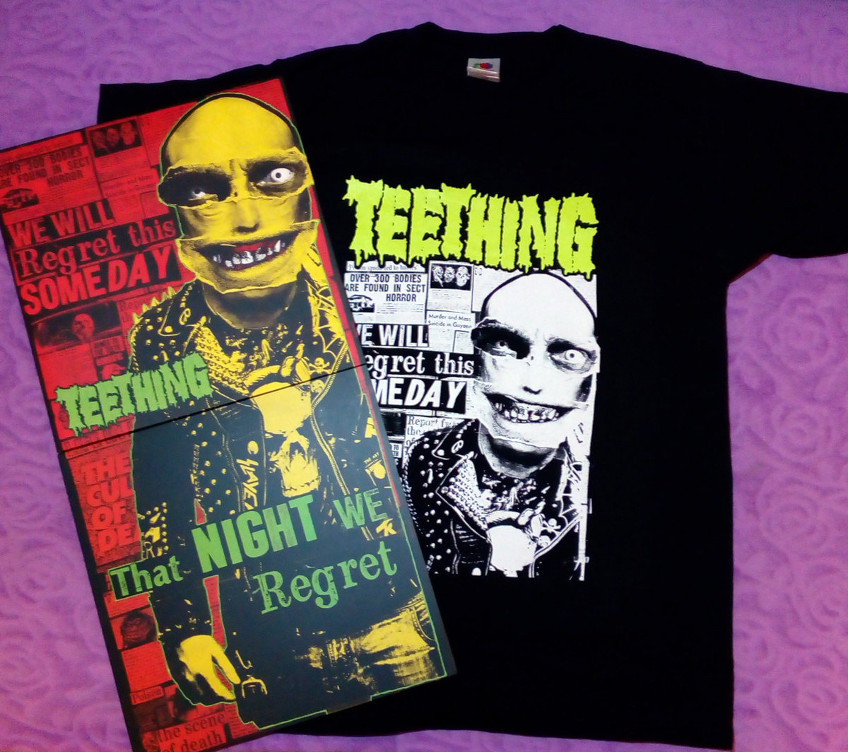 Právě v těchto dnech je k dispozici zbrusu nová deska španělských TEETHING That night we regret 12"EP. Jedná se o druhou a závěrečnou část, která plynule navazuje na předešlou desku We will regret this someday deluxe gatefold 12"LP. Jednostranná černá deska obsahuje šestici vražedných zářezů ala starý Napalm Death nebo Nails. Jako bonus je deska z druhé strany sítotiskově potištěná. Celou nahrávku je možno poslechnout na našem bandcampu deadheroeslabel.bc.com. K dispozici je i předešlá deska TEETHING We will regret this someday 12"LP a stejnojmenné triko jako společná objednávka za výhodnější cenu. Piš prosím sem.