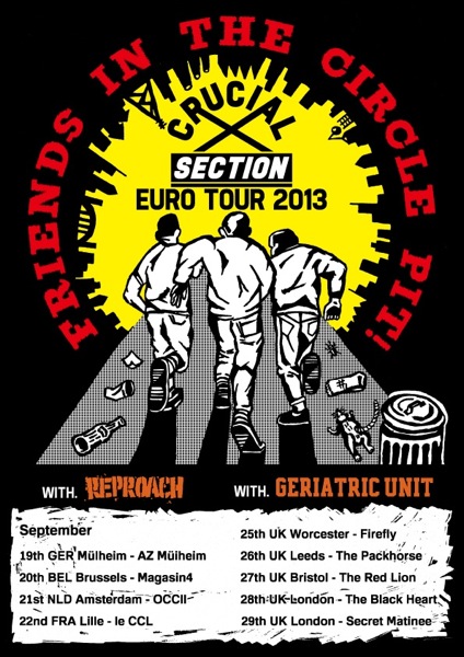 Thrash punx CRUCIAL SECTION vydávají na svém labelu Crew For Life (http://blog.crewforlife-records.com/) v pořadí už čtvrté EP nazvané "Friends In The Circle Pit!" a ve druhé pol. září budou v Evropě - po státech beneluxu jedou s REPROACH, po Anglii s GERIATRIC UNIT. Našim končinám se bohužel tenhle výlet vyhne...