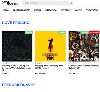 Day After Records zprovoznili po 10 letech nový web shop! U Day After již léta seženeš desky od všech zásadních labelů a určitě i spoustu jiných, stylově různorodých kapel nebo labelů. Nově si můžeš vybírat z přehledně uspořádaných kategorií - HUDBA / PŘEDOBJEDNÁVKY / MERCH / LITERATURA / VÝPRODEJ a vyhledávat podle KAPEL / VYDAVATELŮ a ŽÁNRŮ. Je doplněná i možnost přihlášení a nastavení svého osobního "wishlistu". Více najdeš na dayafter.cz.