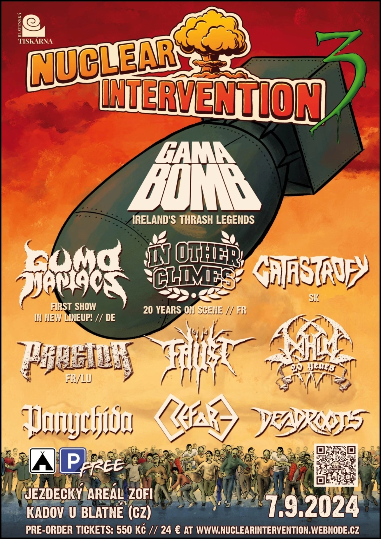 Uvnitř haly budou připraveny 2 výčepy a jeden bar s kořalkami a míchanými drinky (Vámi oblíbený nukleární signature drink "Toxic Waste" samozřejmě nesmí chybět :)) ). Dále v hale najdeš oficiální mech kapel a další metalové stánky. Před halou pak bude připraveno občerstvení, včetně vegetariánských a veganských alternativ. Co by kamenem dohodil je pak na louce u haly zajištěno bezplatné parkování a stanové městečko.