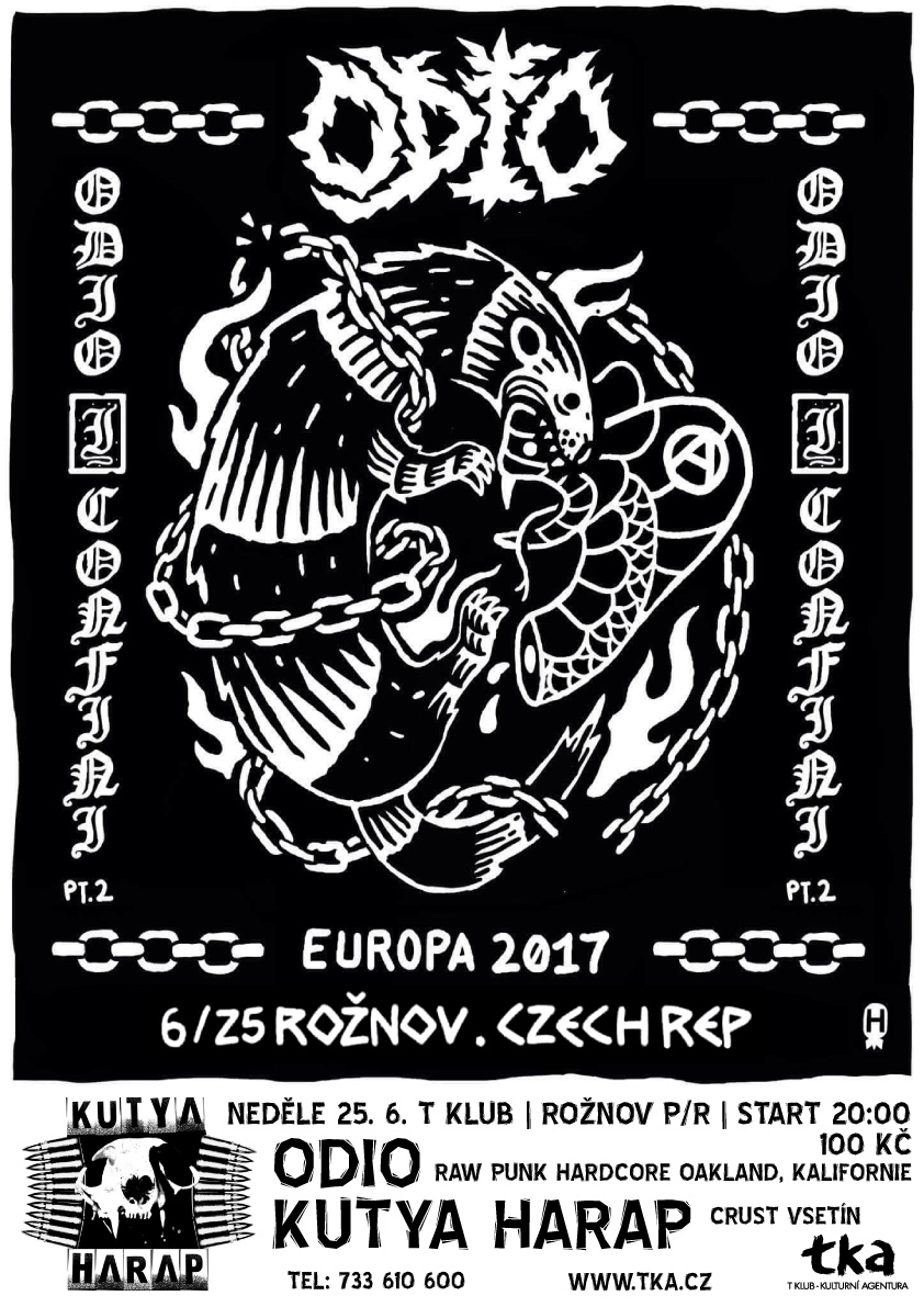 Odio jsou kalifornští punkáči, jejichž hudba osciluje mezi raným japonským hardcorem, raw punkem a crustem. Shrnuto - nářez jak má být a zárukou kvality může být i to, že celé evropské turné pořádá zavedená italská agentura Agipunk. Kutya Harap ze Vsetína bude oaklandským okovaným mladíkům dobrým sparingpartnerem. Crust s láskou k Valašsku.