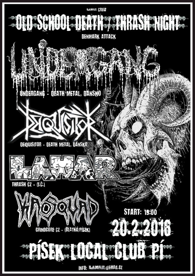Všichni fans poctivýho metalu, zpozorněte! V sobotu 20.2.2016 zavítají do našich končin skuteční králové Skandinávské undergroundové scény, současná špička dánského death metalu, kapela UNDERGANG z Copenhagenu. Do ČR přijedou na jediné dva koncerty – Břeclav a Písek, které odehrají společně s DEIQUISITOR. Taktéž death metalová skvadra z Dánského města Ringsted. Jak v Písku, tak i v Břeclavi si s nimi zahrají jihočeští grindeři KAOSQUAD (Písek/Blatná) a písecký line-up doplní pořádající thrash komando LAHAR. Koncert proběhne v prostorách Local clubu Pí. Naprostá povinnost pro fanoušky hnilobného old school death metalu, ale i thrashe a grindu! Info a rezervace vstupenek na emailu: lahar@email.cz