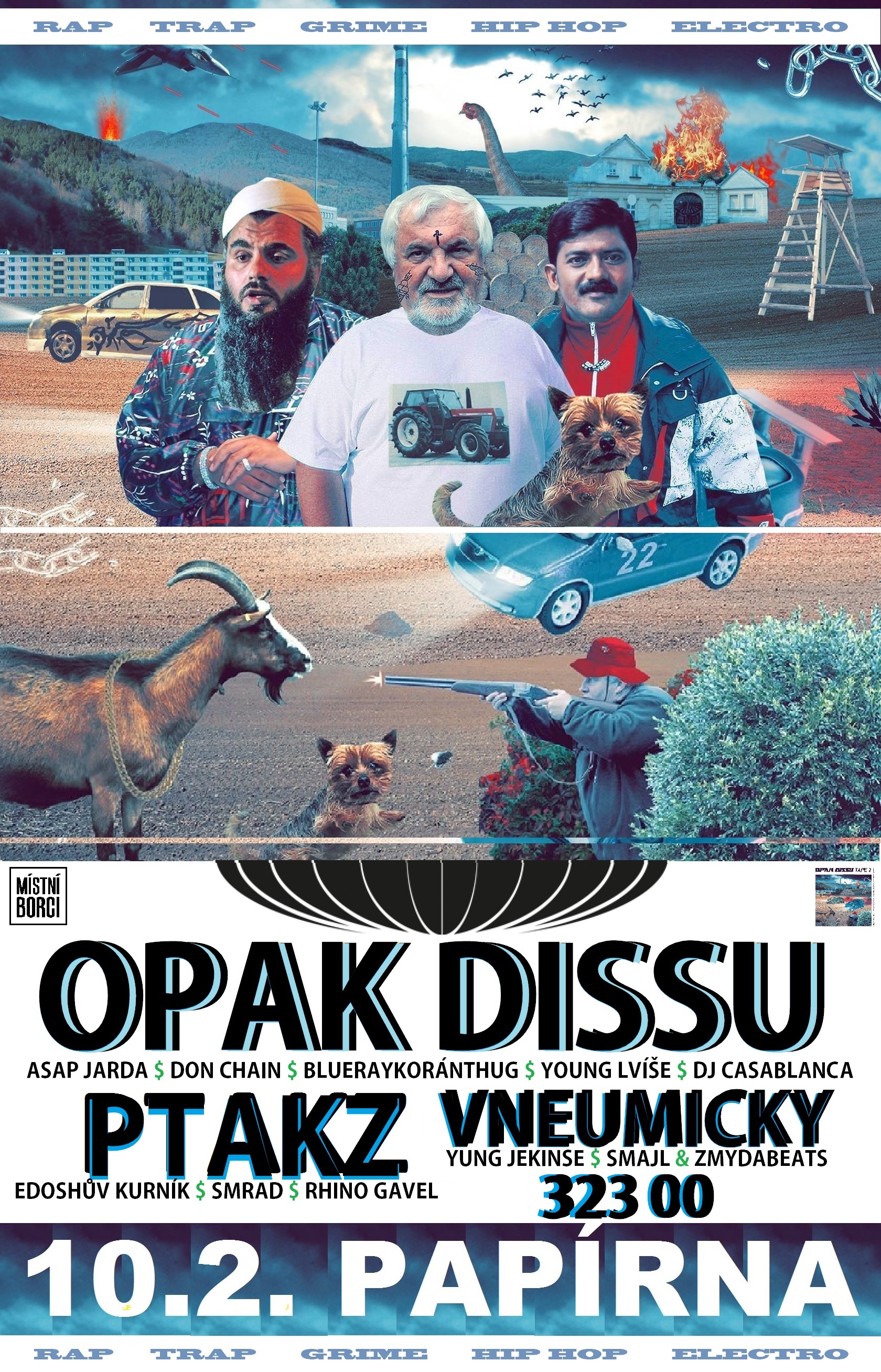 VSTUP: 180,- na místě / 140,- v předprodeji PŘEDPRODEJ: napiš na mistniborec@gmail.com a máš za 140,-! Nebo pozvi 100+ kámošů, pošli nám screenshot a možná vyhraješ vstup za 0,- ;-) >Nultý ročník ČEK GREP FEST 2018! Pokud bude všechno v oukeji, další rok bude zimní fest zaměřenej na progresivní český hudby a tance!< Opak Dissu label je banda z vesnice aka ze srdce Dirty Moravy, kteří dva roky zpět začli posílat ven jejich sound from da vesnica, v normální řeči - vesnickej trappin. V jejich krů to krosí vesnickej badman ASAP Jarda, týpek co má v garáži rozdělanou korolu Don Chain, nasranej jorkšír Young Lvíše, kebabovej král Blueray Koránthug, a v neposlední řadě DJ Casablanka, co sesílá rewindy jak na běžícím páse. Se svou karavanou jezdí po česku už nějakej pátek a zapalují špeluňky kde to jde. Rejvovačky a tancovačky to je vono. https://www.youtube.com/watch?v=l_7McaMJKug https://www.youtube.com/watch?v=scKSHhqECvY Edoshův kurník jsou rapující dada hovada, mezi které patří Edosh (beaty, texty, rapy), Trombóza (texty, rapy), Laktóza (rapy, zpěvy), Qbeat (beatbox), Jakub Matei (fotky, klipy, grafika). Častými a všemi milovanými nečleny kurníku jsou taky Smrad (IdKfA), PhoeniCZ, Rhino Gavel. Kurník je totiž součástí rapujícího gango-hejna –crew PTAKZ, ve kterém se ocitá spolu se spřízněnými projekty a lidmi. Hudba Edoshova kurníku vychází z hip hopu, raw electra, dubstepu, trapu i jazzu a ze špetky primitivismu. Koncerty spočívají v hysterických záchvatech a afektovaných projevech při kvokání do elektronických beatů.kvok. https://www.youtube.com/watch?v=pOB3IWVVi5M https://www.youtube.com/watch?v=TsY_LeN9D38 Vneumicky. Nakonec sme ve spolupráci s Poštou pro Tebe prozkoumali všechny plzeňský ústavy, diskotéky a bary a našli co ste chtěli. Teda nejdřív se to tvářilo, že tohle by fakt nikdo vidět neměl. Až moc kvalitní beaty a flow, na který je připraveno jen pár vyvolených zmedů. Vneumicky jsou Yung Jekinse, Smajl a menežer a kameraman Zmydabeats. A bacha brácho, ke všem svým poselstvím sázej do jůtub kanálu jeden ultraprofi klip za druhým, takže hrozí zacyklení, zpívání textů ve sprše a bohužel i láska. Nedoporučujeme slabším povahám a milovníkům hip hopu! https://www.youtube.com/watch?v=ZNEzXOyFzwQ https://www.youtube.com/watch?v=3CcHWsqDYOA 323 00 323 00 je plzeňské hudební seskupení dělající rap, které před lety založil Puškyn Nikodem a Zkrat Kratochvíl. Nyní je Zkrat včele coby táta této formace. Team má třista dvacet tři organů včetně Dapha, Ell Skandála, Patterese, CleanDirt (Pier,Kozy,T.Trill) Frančese, Taffeze,Jaye Ceaho, Kenobiho a Marka. ''Pro 2018 jsme našli všichni společnou reč a začli dělat na společným projektu. https://www.youtube.com/watch?v=xJ2pOiiLt1Y&t=1404s https://www.youtube.com/watch?v=ACdGhcm5FJI https://www.youtube.com/watch?v=SicuYfFHsrk