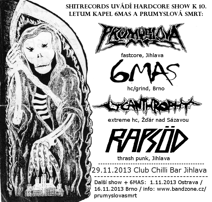 K výročí se uskuteční tři výroční povedený akce těchto nezdárníků, kterým kape pot po místních i světových pódií již celou dekádu. Třetí a poslední akce se koná v Jihlavě za účasti Tebe (:D :D) a mistní smečky RAPSOD a též LYCANTHROPHY, kteří bydlí nedaleko. Navíc PRŮMYSLOVÁ SMRT v tomto datu slaví opravdu přesně 10 let od prvního koncertu, který se odehrál v legendárním jihlavském fet klubu AMC neboli Áčko 29.11.2003. Přijď se s námi pobavit a popít. Ochranou přílbu a náhradní trenky s sebou.