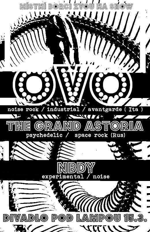 OvO [Ita] noise rock / industrial / avantgarde https://ovomusic.bandcamp.com/ Svět temných šamanských rytmů se potkal se světem noisové, industriální avant-gardy, aby společně utvořili přívalovou vlnu mocné energie, která převyšuje vše pozemské. Italské duo se vyznačuje především intenzitou a nekompromisností svého projevu a atmosférou připomínající spíše náboženský rituál primitivních národů, než koncert v klasickém pojetí. Zaříkávání se zarývá pod kůži až mrazí a ve spojení s hypnotickým bubnováním a přívalem zvuků navozuje extatické stavy. Kapela působí na scéně již 15 let a na kontě má přes deset alb. Kdo byl přítomen na jejich vystoupení na loňském ročníku Psy-High, mohl zažít bouři vzbuzující dojem apokalypsy, kdy po nebi lítaly myriády blesků a vála vichřice, vzduchem se nesl zlomocný hlas smíšený s hřměním, a neustál ani při zřícení stage nápory větru. Konec světa však nenastal, takže můžete přijít pod Lampu na další pekelnou bouři! odkazy: https://www.youtube.com/watch?v=28UZcgQ9gN8 https://www.youtube.com/watch?v=S01la46GAAw https://www.youtube.com/watch?v=AUqBrr9h2mI https://www.youtube.com/watch?v=JJrbW2lxnKc THE GRAND ASTORIA [Rus] psychedelic / stoner / space rock https://thegrandastoria.bandcamp.com/ Pětice ze Saint Peterburgu ve své tvorbě vychází ze sedmdesátých let, ovšem připojuje k ní notnou dávku progrese a jejich hudba je kombinací mnoha žánrů, nejvíce doma se cítí však ve vodách psychedelického rocku. Tahle kapela vás spolehlivě provede na své toulce vesmírem a budete svědky galaktických příběhů obsažených v nafuzzovaných riffech a táhlých sólíčkách! Stačí si stoupnout před stage, naladit svoji bytost na správnou vlnu a už se jen nechat unášet napříč časoprostorem. Za 6 let svojí existence stihli vydat už 7 alb a mimo jiné také split CD s US Christmass. Připravte si skafandry, odlítáme 15. března! odkazy: https://www.youtube.com/watch?v=KE1Nnsk50XE https://www.youtube.com/watch?v=2rO0m2yEPt8 NBDY noise / experimental https://mrnbdy.bandcamp.com/ O tuzemskou podporu italského pekla a ruské space odysey se nepostará nikdo jiný než noisovému publiku dobře známý NBDY. Tenhle věrný přítel dvounohých i čtyřnohých duší se srdcem a ušima na pravém místě se nebojí do vás naprat tolik hluku, co se do vás jen vejde! Svoje prožitky předává publiku prostřednictvím alchymie krabiček a působnosti zvuku. Nechte svým tělem proudit všechny frekvence a pozorně poslouchejte, o čem si vibrující atomy povídají! Na místě bude možnost zakoupení některých vymazlených DIY fošen z jeho dílny Dog Bless You!