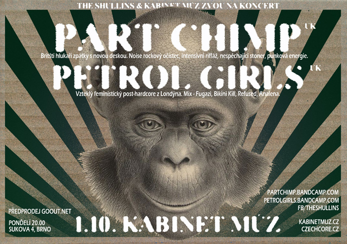 PART CHIMP (UK) - "Nejhlasitější kapela z Anglie" takhle se propírá dnes již čtveřice z Londýna v hudebních žumpách. Hlasitost, rituálnost, pravěké postupy, bezlítostná valivost a hudební očista. Tak se dá v jednoduchosti popsat parta, která za 18 let existence "stačila" vydat čtyři alba. To poslední po delší pauze vyšlo loni a opět u respektovaného vydavatelství Rock Action Records za kterým stojí členové Mogwai a které stojí třeba za deskami Envy, překvapivě Mogwai a nebo Torche se kterými i Part Chimp vydali split EP. Jednoduché postupy a zničující hluková síla nás odkáže k ikonám jako Black Sabbath, Sonic Youth, Big Business, Earth. Duševní očista za účasti těch nejlepších lektorů z Londýna, kteří špínu taví v decibely a zbytečnou složitost vystřídali ze repetativní očistec založený v jednoduchých omamných riffech. Noise rocková sílá, nespěchající stoner a punková energie se v Kabinetu Múz bude podávat na perském koberci.