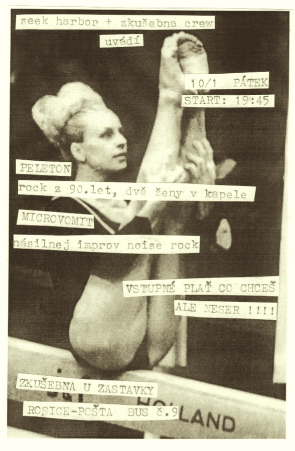 seek harbor + zkušebna crew uvádí koncert na zkušebně v Rosicich nad Labem / Pardubice, hned u zastávky bus. č 9 (Rosice Pošta), v budově Sokolovny PELETON (CZ, Praha - Silver Rocket Records) Dvě ženy a provařený týpek Hej Kámo a.k.a. Jimi Tvarix za škopkama. Očekávej devadesátkami načichlý indie rock s mohutným odérem tehdejších Dischord kapel!! Kazeta brzy na Silver Rocket MICROVOMIT (CZ, Budějovice - Naab/Stoned to Death) Kultovní trio, budějický improv noise rock. Tma, hluk, extáze! V Pardubicích již po třetí, tohle si nenech ujít! Jejich poslední koncert v Pardubické Myslivně už je teď legendou! http://microvomit.bandcamp.com/ Začneme zhruba v 19:45 - 20:15 Vstupné kolik chceš, ale určitě nám něco dej, všechno půjde kapelám! Na místě bude k dispozici alko a speciální drink, hospoda kam si můžeš skočit na točený je hned vedle. Klidně přijeď vlakem, kup si jizdenku do Rosic nad Labem, na hlaváku v Pardubicích přestup na vlak Hradec Králové nebo Chrudim, vystup v Rosicích, výjdi na most, dej se doprava a za 3 minuty si na zkušebně. Je to v Sokolu hned vele hospody a Černýho Tulipána. Víc info na mailu (seekharbor@gmail.com), nebo zavolej (608 418 923)
