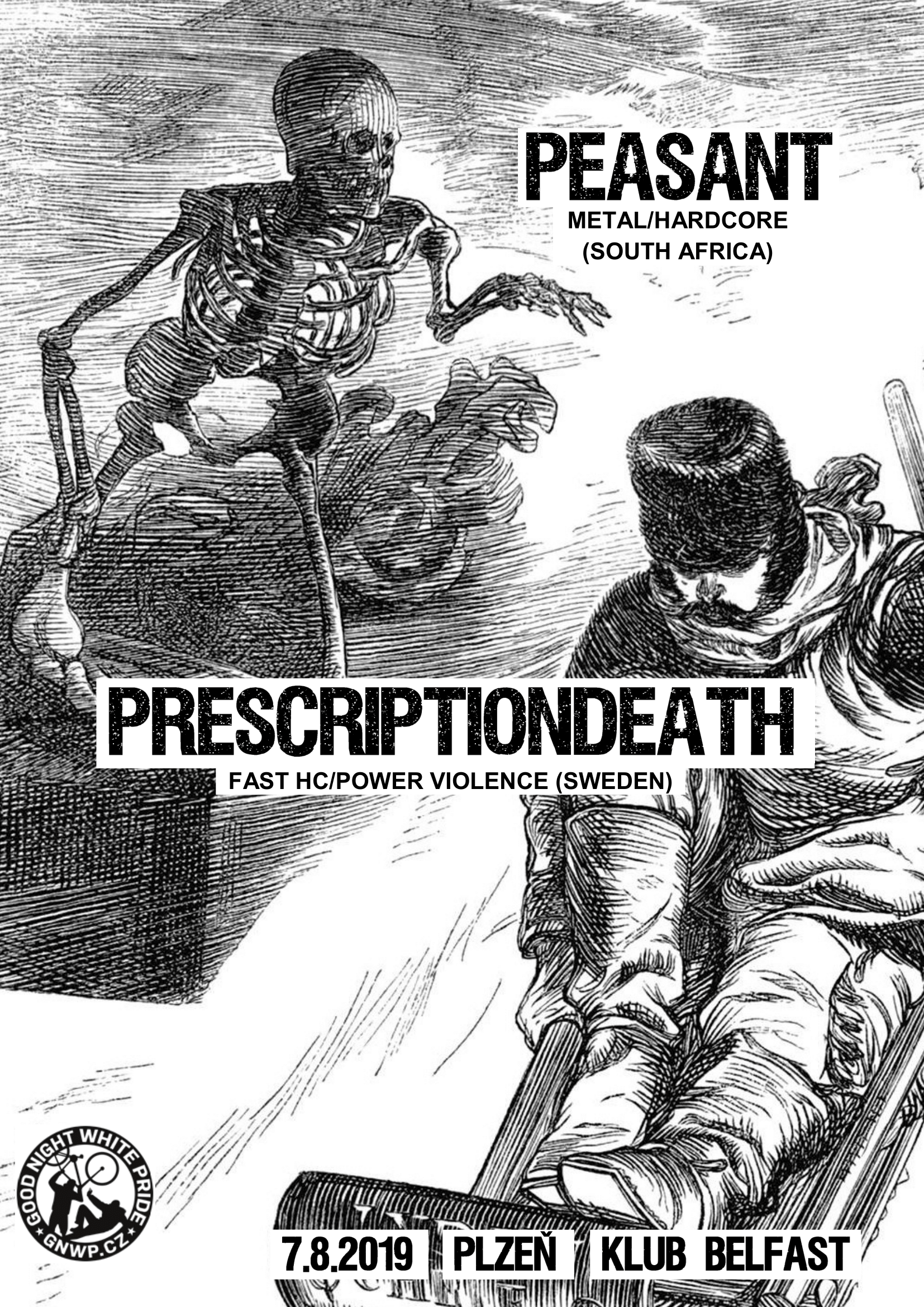 Letní čaje v týdnu - dvě kapely na společným turné, dva konce stejnýho d.i.y. světa, špunty do uší nechej doma, posero!!! Trashing punk/metal hardcore z jihoafrického Capetown PEASANT (https://peasant.bandcamp.com/) doprovodí PRESCRIPTIONDEATH grindcore fast crusty válcovna za studena ze Švédska (https://prescriptiondeath.bandcamp.com/). Zve Solidarity crew.